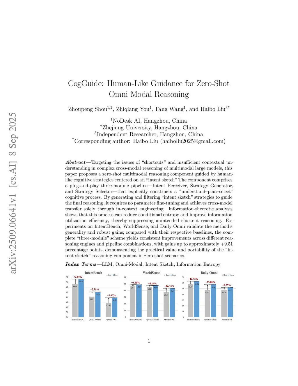 Targeting the issues of "shortcuts" and insufficient contextual understanding in complex cross-modal reasoning of multimodal large models, this paper proposes a zero-shot multimodal reasoning component guided by human-like cognitive strategies centered on an "intent sketch". The component comprises a plug-and-play three-module pipeline-Intent Perceiver, Strategy Generator, and Strategy Selector-that explicitly constructs a "understand-plan-select" cognitive process. By generating and filtering "intent sketch" strategies to guide the final reasoning, it requires no parameter fine-tuning and achieves cross-model transfer solely through in-context engineering. Information-theoretic analysis shows that this process can reduce conditional entropy and improve information utilization efficiency, thereby suppressing unintended shortcut reasoning. Experiments on IntentBench, WorldSense, and Daily-Omni validate the method's generality and robust gains; compared with their respective baselines, the complete "three-module" scheme yields consistent improvements across different reasoning engines and pipeline combinations, with gains up to approximately 9.51 percentage points, demonstrating the practical value and portability of the "intent sketch" reasoning component in zero-shot scenarios.