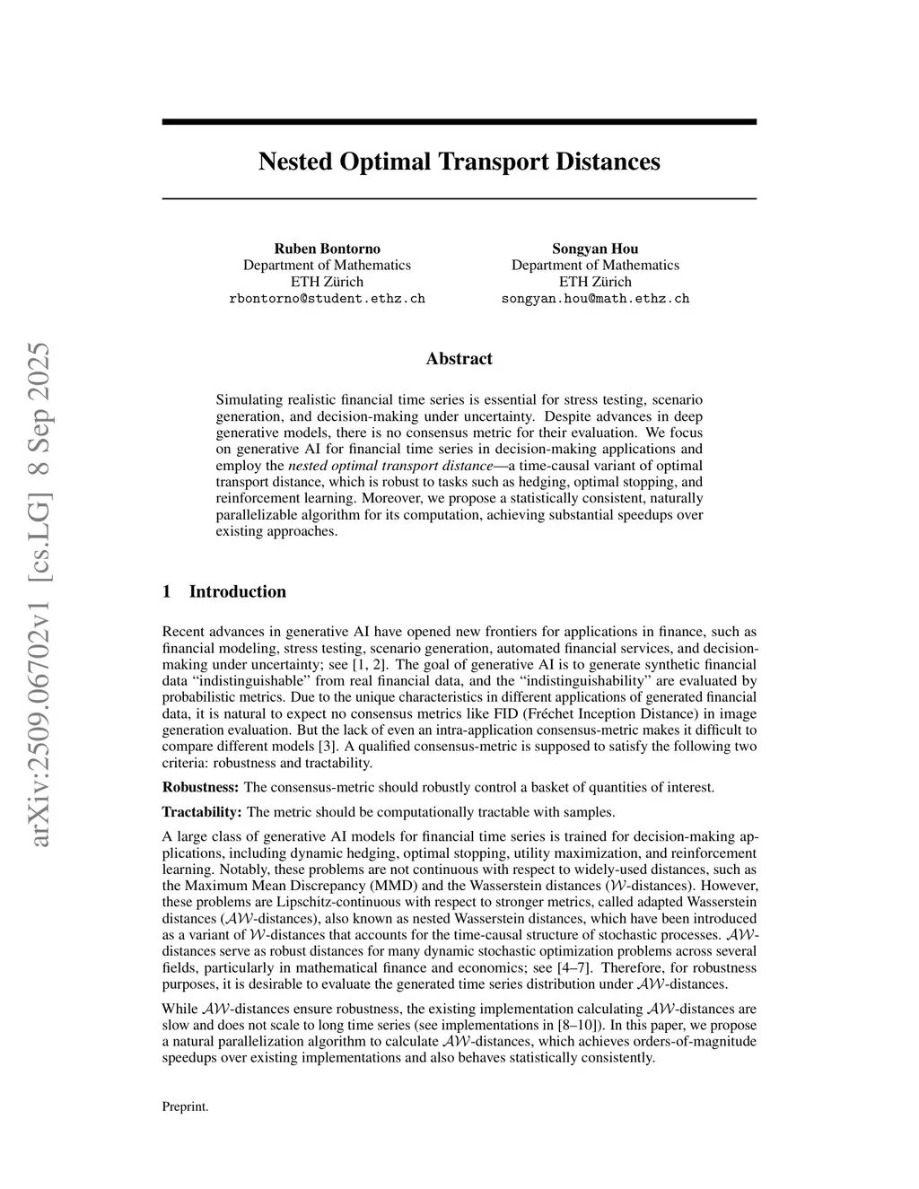 Simulating realistic financial time series is essential for stress testing, scenario generation, and decision-making under uncertainty. Despite advances in deep generative models, there is no consensus metric for their evaluation. We focus on generative AI for financial time series in decision-making applications and employ the nested optimal transport distance, a time-causal variant of optimal transport distance, which is robust to tasks such as hedging, optimal stopping, and reinforcement learning. Moreover, we propose a statistically consistent, naturally parallelizable algorithm for its computation, achieving substantial speedups over existing approaches.
