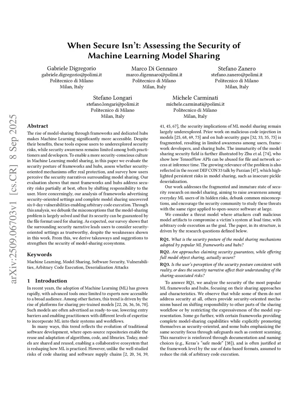 When Secure Isn't: Assessing the Security of Machine Learning Model Sharing