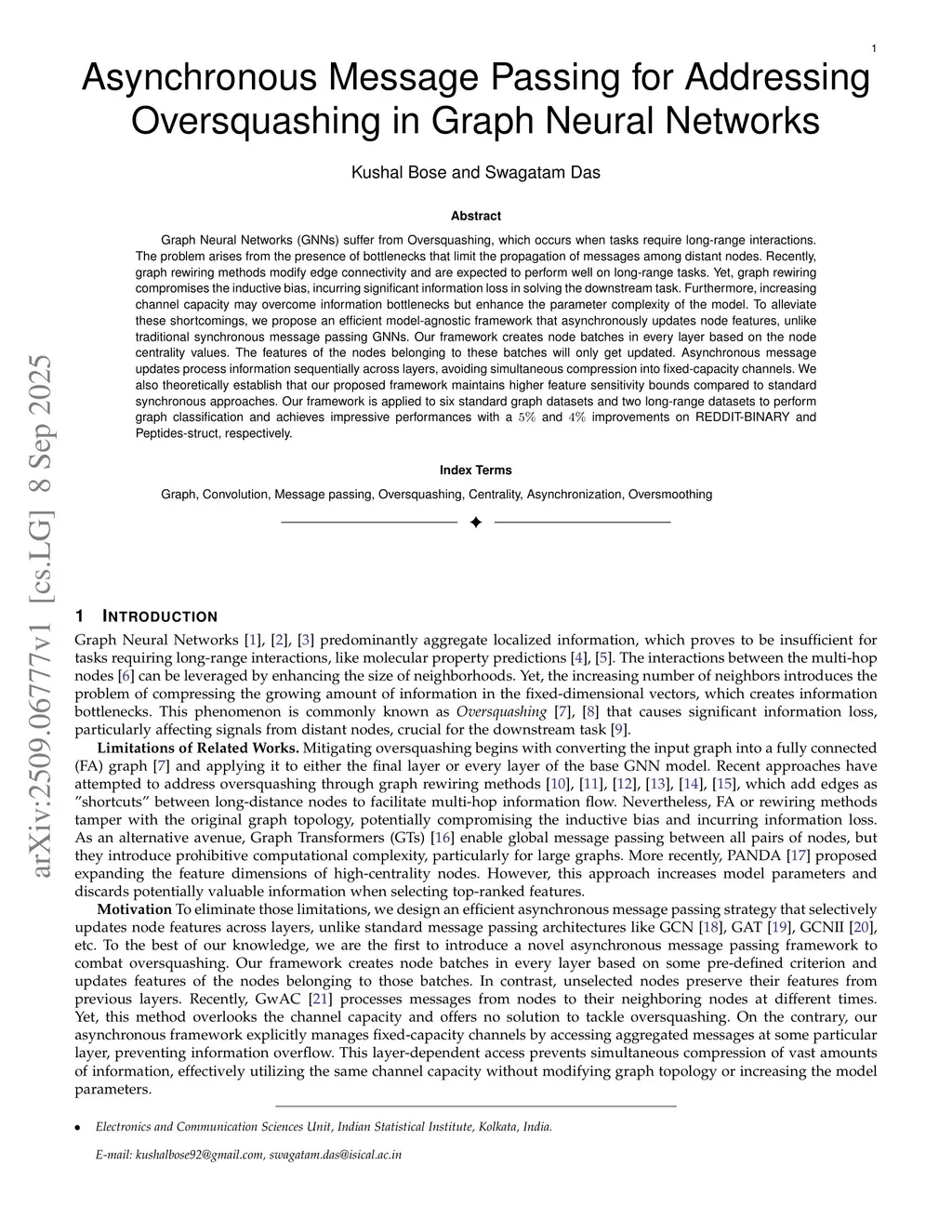 Graph Neural Networks (GNNs) suffer from Oversquashing, which occurs when tasks require long-range interactions. The problem arises from the presence of bottlenecks that limit the propagation of messages among distant nodes. Recently, graph rewiring methods modify edge connectivity and are expected to perform well on long-range tasks. Yet, graph rewiring compromises the inductive bias, incurring significant information loss in solving the downstream task. Furthermore, increasing channel capacity may overcome information bottlenecks but enhance the parameter complexity of the model. To alleviate these shortcomings, we propose an efficient model-agnostic framework that asynchronously updates node features, unlike traditional synchronous message passing GNNs. Our framework creates node batches in every layer based on the node centrality values. The features of the nodes belonging to these batches will only get updated. Asynchronous message updates process information sequentially across layers, avoiding simultaneous compression into fixed-capacity channels. We also theoretically establish that our proposed framework maintains higher feature sensitivity bounds compared to standard synchronous approaches. Our framework is applied to six standard graph datasets and two long-range datasets to perform graph classification and achieves impressive performances with a and improvements on REDDIT-BINARY and Peptides-struct, respectively.