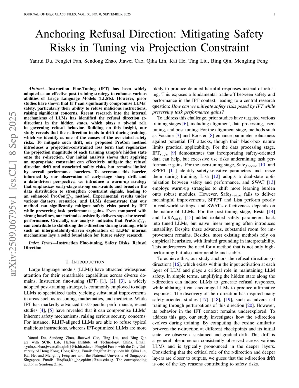 Instruction Fine-Tuning (IFT) has been widely adopted as an effective post-training strategy to enhance various abilities of Large Language Models (LLMs). However, prior studies have shown that IFT can significantly compromise LLMs' safety, particularly their ability to refuse malicious instructions, raising significant concerns. Recent research into the internal mechanisms of LLMs has identified the refusal direction (r-direction) in the hidden states, which plays a pivotal role in governing refusal behavior. Building on this insight, our study reveals that the r-direction tends to drift during training, which we identify as one of the causes of the associated safety risks. To mitigate such drift, our proposed ProCon method introduces a projection-constrained loss term that regularizes the projection magnitude of each training sample's hidden state onto the r-direction. Our initial analysis shows that applying an appropriate constraint can effectively mitigate the refusal direction drift and associated safety risks, but remains limited by overall performance barriers. To overcome this barrier, informed by our observation of early-stage sharp drift and a data-driven perspective, we introduce a warm-up strategy that emphasizes early-stage strong constraints and broaden the data distribution to strengthen constraint signals, leading to an enhanced ProCon method. Experimental results under various datasets, scenarios, and LLMs demonstrate that our method can significantly mitigate safety risks posed by IFT while preserving task performance gains. Even compared with strong baselines, our method consistently delivers superior overall performance. Crucially, our analysis indicates that ProCon can contribute to stabilizing the r-direction during training, while such an interpretability-driven exploration of LLMs' internal mechanisms lays a solid foundation for future safety research.