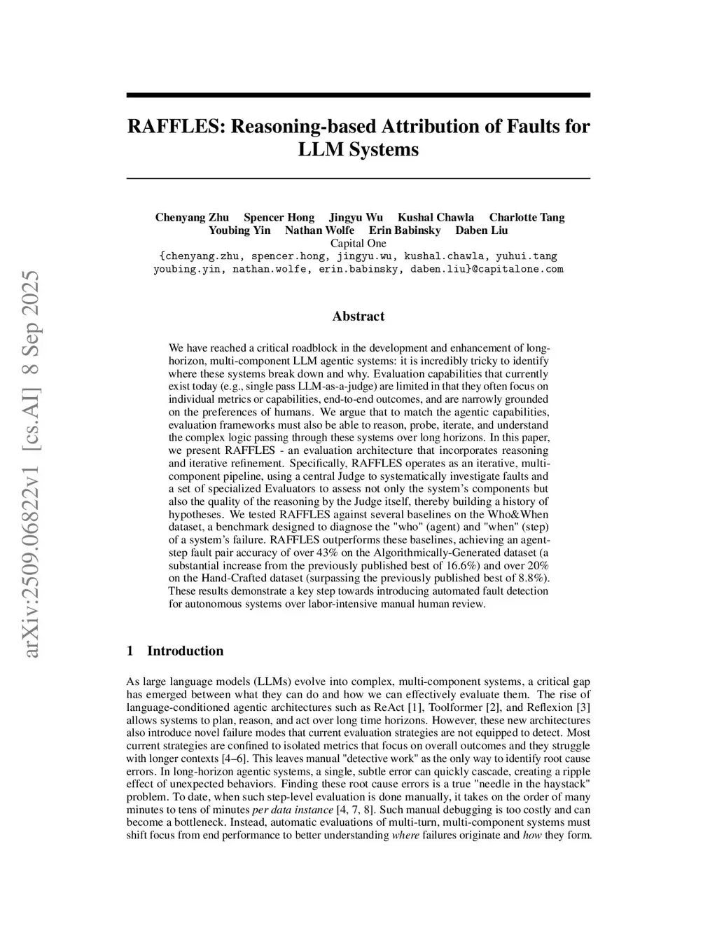 The advent of complex, interconnected long-horizon LLM systems has made it incredibly tricky to identify where and when these systems break down. Evaluation capabilities that currently exist today are limited in that they often focus on simple metrics, end-to-end outcomes, and are dependent on the perspectives of humans. In order to match the increasing complexity of these many component systems, evaluation frameworks must also be able to reason, probe, iterate, and understand the nuanced logic passing through these systems. In this paper, we present RAFFLES, an offline evaluation architecture that incorporates iterative reasoning. Specifically, RAFFLES operates as an iterative, multi-component pipeline, using a central Judge to systematically identify faults and a set of specialized Evaluators to assess the quality of the candidate faults as well as rationales of the Judge. We evaluated RAFFLES with several benchmarks - the Who&When dataset to identify step-level faults in multi-agent systems and the ReasonEval datasets to diagnose step-level mathematical reasoning errors. RAFFLES outperforms strong baselines, achieving an accuracy of over 20% and 50% on the Who&When Hand-Crafted and Algorithmically-Generated datasets, and over 80% on the ReasonEval datasets. These results demonstrate a key step towards introducing automated fault detection for autonomous systems over labor-intensive manual review.