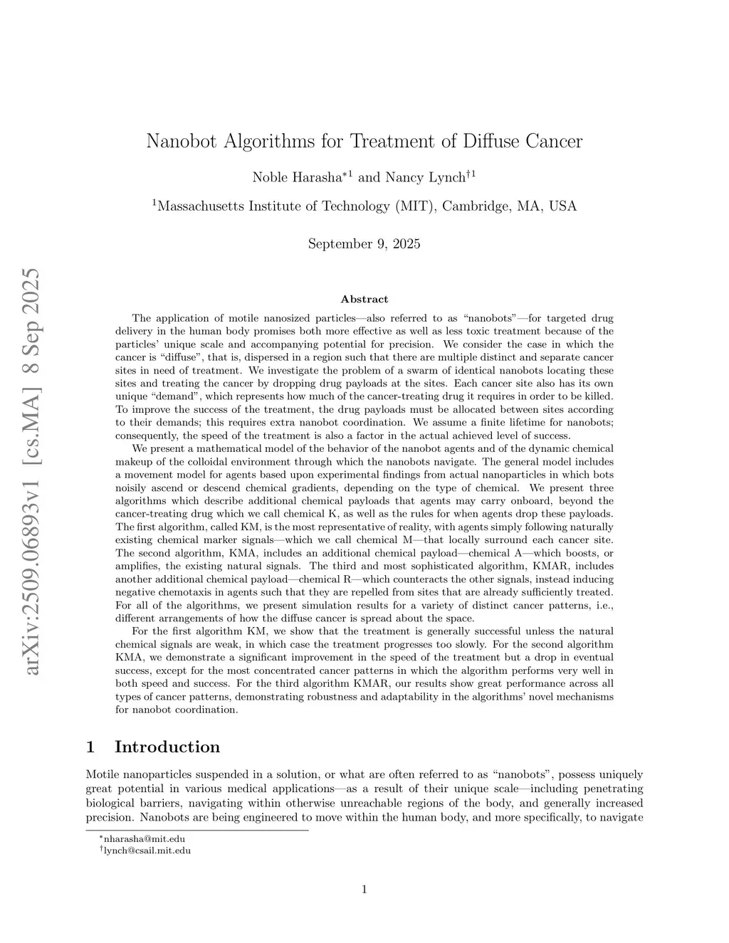 Motile nanosized particles, or "nanobots", promise more effective and less toxic targeted drug delivery because of their unique scale and precision. We consider the case in which the cancer is "diffuse", dispersed such that there are multiple distinct cancer sites. We investigate the problem of a swarm of nanobots locating these sites and treating them by dropping drug payloads at the sites. To improve the success of the treatment, the drug payloads must be allocated between sites according to their "demands"; this requires extra nanobot coordination. We present a mathematical model of the behavior of the nanobot agents and of their colloidal environment. This includes a movement model for agents based upon experimental findings from actual nanoparticles in which bots noisily ascend and descend chemical gradients. We present three algorithms: The first algorithm, called KM, is the most representative of reality, with agents simply following naturally existing chemical signals that surround each cancer site. The second algorithm, KMA, includes an additional chemical payload which amplifies the existing natural signals. The third algorithm, KMAR, includes another additional chemical payload which counteracts the other signals, instead inducing negative chemotaxis in agents such that they are repelled from sites that are already sufficiently treated. We present simulation results for all algorithms across different types of cancer arrangements. For KM, we show that the treatment is generally successful unless the natural chemical signals are weak, in which case the treatment progresses too slowly. For KMA, we demonstrate a significant improvement in treatment speed but a drop in eventual success, except for concentrated cancer patterns. For KMAR, our results show great performance across all types of cancer patterns, demonstrating robustness and adaptability.