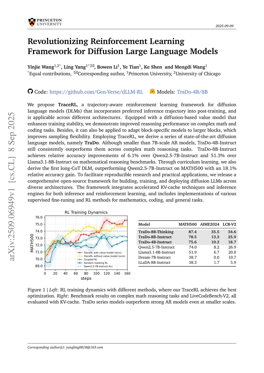 We propose TraceRL, a trajectory-aware reinforcement learning framework for diffusion language models (DLMs) that incorporates preferred inference trajectory into post-training, and is applicable across different architectures. Equipped with a diffusion-based value model that enhances training stability, we demonstrate improved reasoning performance on complex math and coding tasks. Besides, it can also be applied to adapt block-specific models to larger blocks, which improves sampling flexibility. Employing TraceRL, we derive a series of state-of-the-art diffusion language models, namely TraDo. Although smaller than 7B-scale AR models, TraDo-4B-Instruct still consistently outperforms them across complex math reasoning tasks. TraDo-8B-Instruct achieves relative accuracy improvements of 6.1% over Qwen2.5-7B-Instruct and 51.3% over Llama3.1-8B-Instruct on mathematical reasoning benchmarks. Through curriculum learning, we also derive the first long-CoT DLM, outperforming Qwen2.5-7B-Instruct on MATH500 with an 18.1% relative accuracy gain. To facilitate reproducible research and practical applications, we release a comprehensive open-source framework for building, training, and deploying diffusion LLMs across diverse architectures. The framework integrates accelerated KV-cache techniques and inference engines for both inference and reinforcement learning, and includes implementations of various supervised fine-tuning and RL methods for mathematics, coding, and general tasks. Code and Models:this https URL