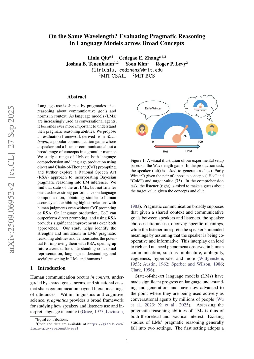 Language use is shaped by pragmatics -- i.e., reasoning about communicative goals and norms in context. As language models (LMs) are increasingly used as conversational agents, it becomes ever more important to understand their pragmatic reasoning abilities. We propose an evaluation framework derived from Wavelength, a popular communication game where a speaker and a listener communicate about a broad range of concepts in a granular manner. We study a range of LMs on both language comprehension and language production using direct and Chain-of-Thought (CoT) prompting, and further explore a Rational Speech Act (RSA) approach to incorporating Bayesian pragmatic reasoning into LM inference. We find that state-of-the-art LMs, but not smaller ones, achieve strong performance on language comprehension, obtaining similar-to-human accuracy and exhibiting high correlations with human judgments even without CoT prompting or RSA. On language production, CoT can outperform direct prompting, and using RSA provides significant improvements over both approaches. Our study helps identify the strengths and limitations in LMs' pragmatic reasoning abilities and demonstrates the potential for improving them with RSA, opening up future avenues for understanding conceptual representation, language understanding, and social reasoning in LMs and humans.