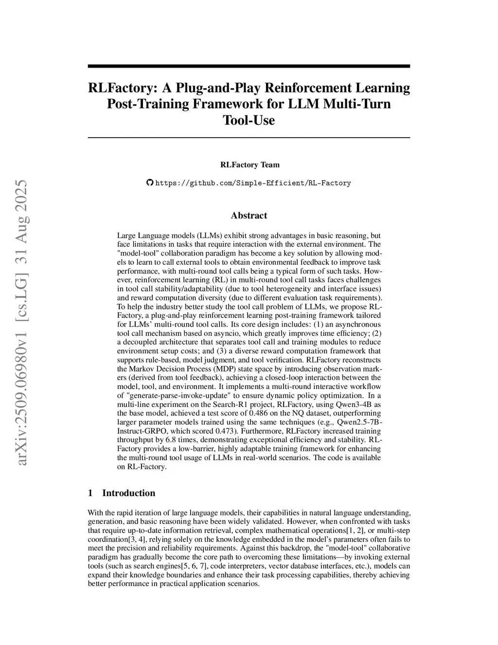 Large language models excel at basic reasoning but struggle with tasks that require interaction with external tools. We present RLFactory, a plug-and-play reinforcement learning post-training framework for multi-round tool use. RLFactory tackles (i) tool-call stability and adaptability amid tool heterogeneity and interface issues via an asyncio-based asynchronous caller and a decoupled tool/training architecture, and (ii) diverse evaluation needs via a reward layer supporting rule-based, model-judgment, and tool-verification signals. It reconstructs the MDP by introducing observation markers from tool feedback, closing the loop among model, tools, and environment, and implements a generate-parse-invoke-update workflow for dynamic policy optimization. On Search-R1 with Qwen3-4B, RLFactory achieves a 0.486 test score on the Natural Questions (NQ) dataset, surpassing larger models trained with similar techniques (e.g., Qwen2.5-7B-Instruct-GRPO at 0.473), and increases training throughput by 6.8x. RLFactory provides a low-barrier, highly adaptable framework for strengthening multi-round tool use of LLMs in real-world scenarios. Code:this https URL.