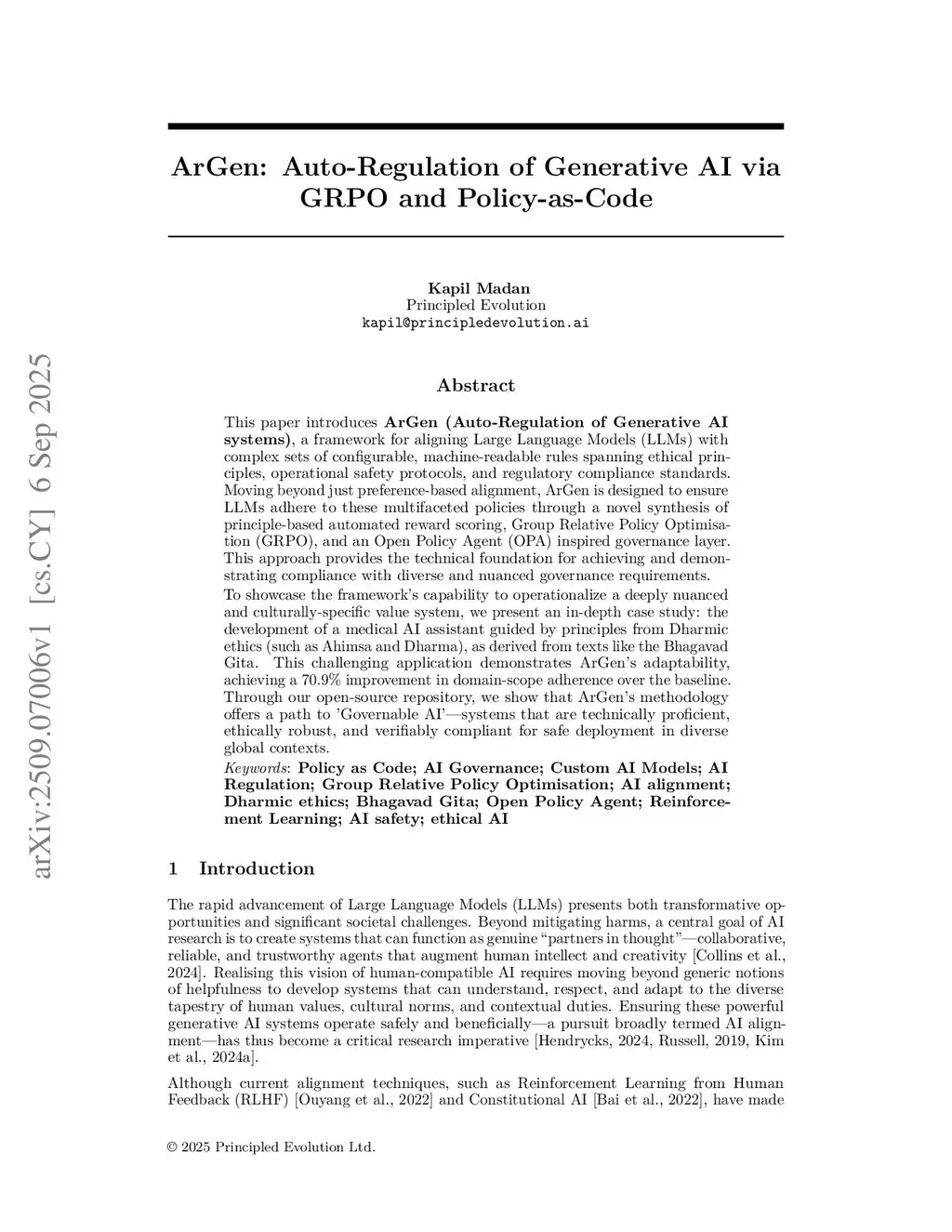 This paper introduces ArGen (Auto-Regulation of Generative AI systems), a framework for aligning Large Language Models (LLMs) with complex sets of configurable, machine-readable rules spanning ethical principles, operational safety protocols, and regulatory compliance standards. Moving beyond just preference-based alignment, ArGen is designed to ensure LLMs adhere to these multifaceted policies through a novel synthesis of principle-based automated reward scoring, Group Relative Policy Optimisation (GRPO), and an Open Policy Agent (OPA) inspired governance layer. This approach provides the technical foundation for achieving and demonstrating compliance with diverse and nuanced governance requirements. To showcase the framework's capability to operationalize a deeply nuanced and culturally-specific value system, we present an in-depth case study: the development of a medical AI assistant guided by principles from Dharmic ethics (such as Ahimsa and Dharma), as derived from texts like the Bhagavad Gita. This challenging application demonstrates ArGen's adaptability, achieving a 70.9% improvement in domain-scope adherence over the baseline. Through our open-source repository, we show that ArGen's methodology offers a path to 'Governable Al' systems that are technically proficient, ethically robust, and verifiably compliant for safe deployment in diverse global contexts.