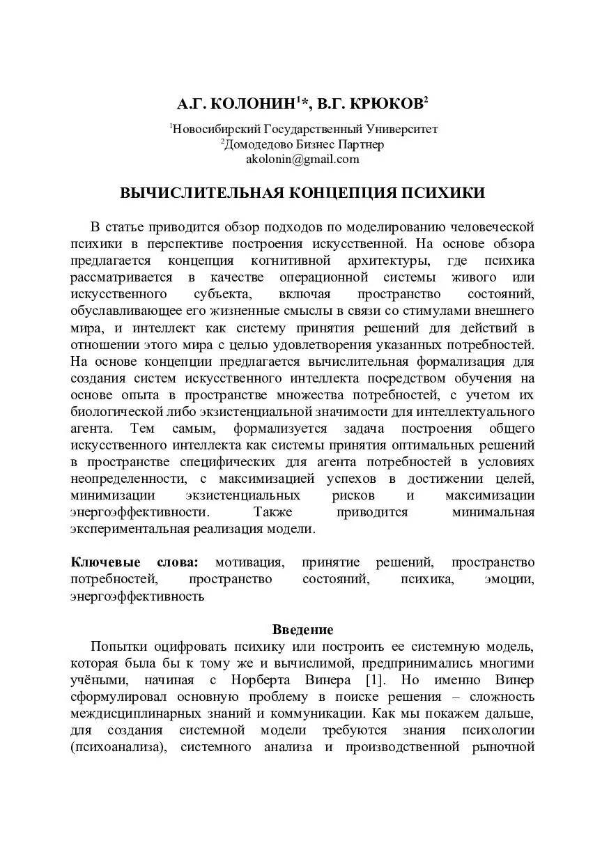 The article provides an overview of approaches to modeling the human psyche in the perspective of building an artificial one. Based on the review, a concept of cognitive architecture is proposed, where the psyche is considered as an operating system of a living or artificial subject, including a space of needs that determines its life meanings in connection with stimuli from the external world, and intelligence as a decision-making system for actions in relation to this world in order to satisfy these needs. Based on the concept, a computational formalization is proposed for creating artificial intelligence systems through learning from experience in the space of a space of needs, taking into account their biological or existential significance for an intelligent agent. Thus, the problem of building general artificial intelligence as a system for making optimal decisions in the space of agent-specific needs under conditions of uncertainty is formalized, with maximization of success in achieving goals, minimization of existential risks and maximization of energy efficiency. A minimal experimental implementation of the model is also provided.