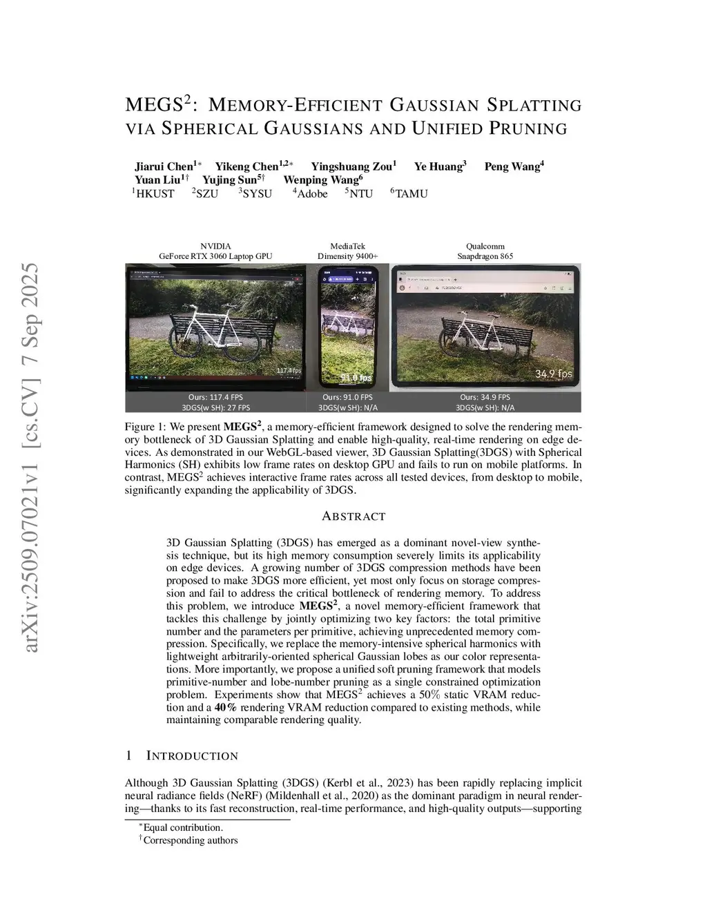 MEGS: Memory-Efficient Gaussian Splatting via Spherical Gaussians and Unified Pruning