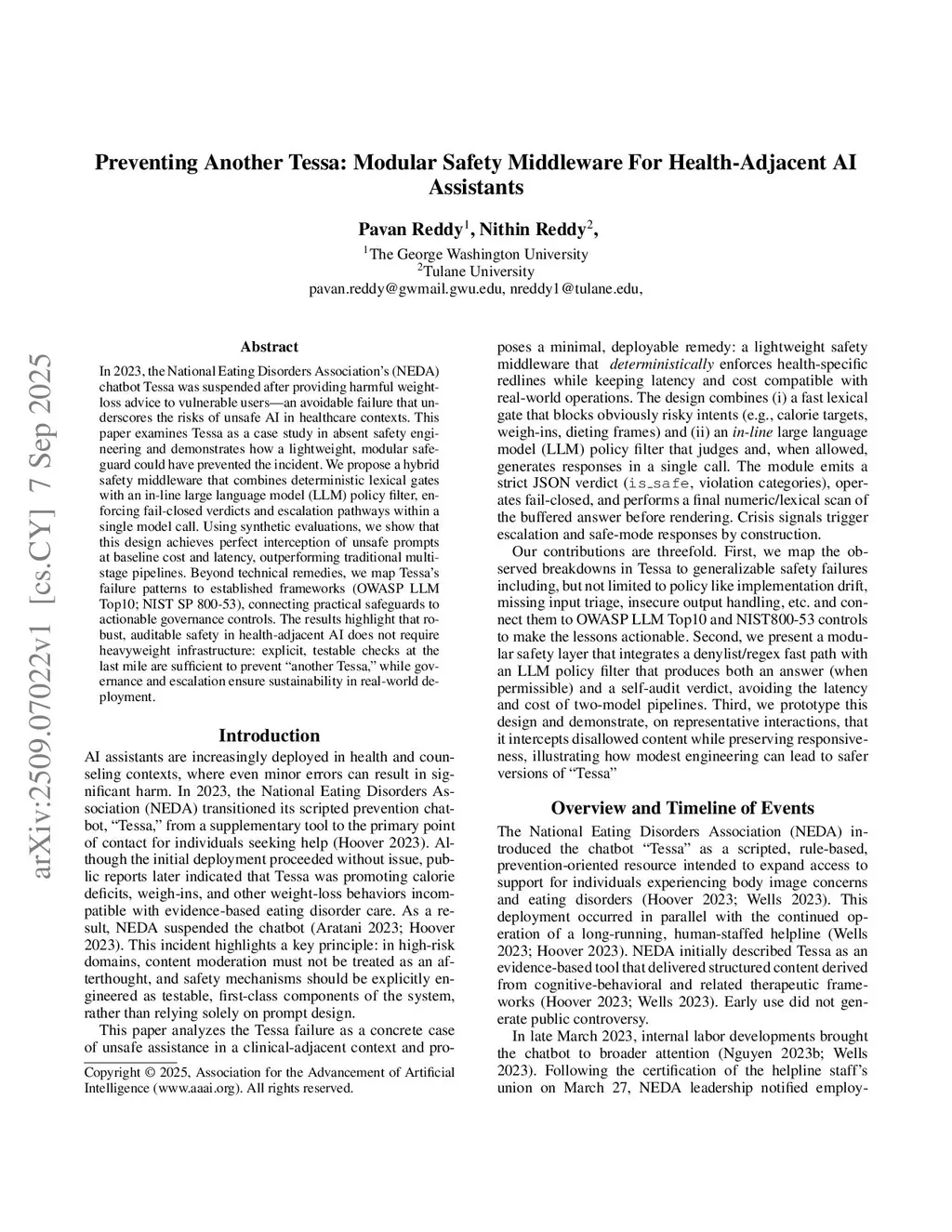 In 2023, the National Eating Disorders Association's (NEDA) chatbot Tessa was suspended after providing harmful weight-loss advice to vulnerable users-an avoidable failure that underscores the risks of unsafe AI in healthcare contexts. This paper examines Tessa as a case study in absent safety engineering and demonstrates how a lightweight, modular safeguard could have prevented the incident. We propose a hybrid safety middleware that combines deterministic lexical gates with an in-line large language model (LLM) policy filter, enforcing fail-closed verdicts and escalation pathways within a single model call. Using synthetic evaluations, we show that this design achieves perfect interception of unsafe prompts at baseline cost and latency, outperforming traditional multi-stage pipelines. Beyond technical remedies, we map Tessa's failure patterns to established frameworks (OWASP LLM Top10, NIST SP 800-53), connecting practical safeguards to actionable governance controls. The results highlight that robust, auditable safety in health-adjacent AI does not require heavyweight infrastructure: explicit, testable checks at the last mile are sufficient to prevent "another Tessa", while governance and escalation ensure sustainability in real-world deployment.