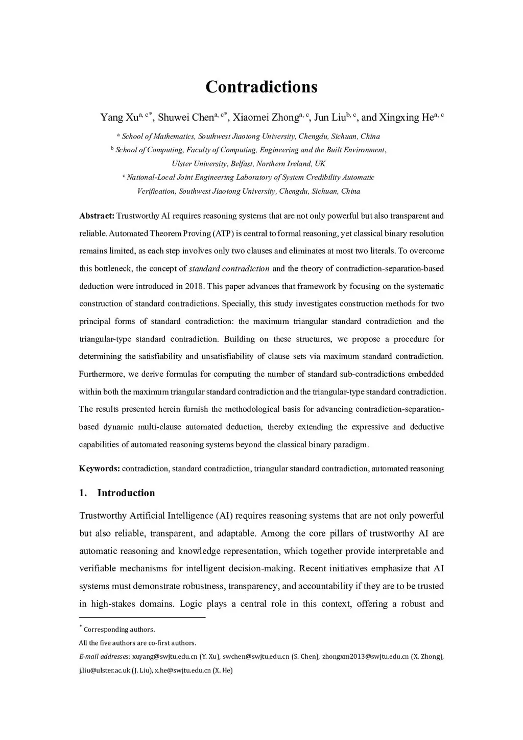Trustworthy AI requires reasoning systems that are not only powerful but also transparent and reliable. Automated Theorem Proving (ATP) is central to formal reasoning, yet classical binary resolution remains limited, as each step involves only two clauses and eliminates at most two literals. To overcome this bottleneck, the concept of standard contradiction and the theory of contradiction-separation-based deduction were introduced in 2018. This paper advances that framework by focusing on the systematic construction of standard contradictions. Specially, this study investigates construction methods for two principal forms of standard contradiction: the maximum triangular standard contradiction and the triangular-type standard contradiction. Building on these structures, we propose a procedure for determining the satisfiability and unsatisfiability of clause sets via maximum standard contradiction. Furthermore, we derive formulas for computing the number of standard sub-contradictions embedded within both the maximum triangular standard contradiction and the triangular-type standard contradiction. The results presented herein furnish the methodological basis for advancing contradiction-separation-based dynamic multi-clause automated deduction, thereby extending the expressive and deductive capabilities of automated reasoning systems beyond the classical binary paradigm.