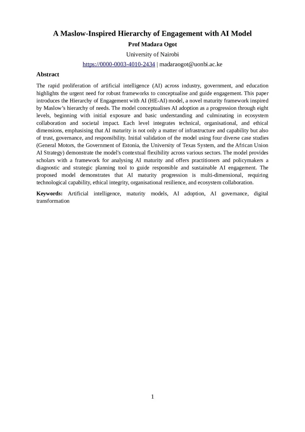 The rapid proliferation of artificial intelligence (AI) across industry, government, and education highlights the urgent need for robust frameworks to conceptualise and guide engagement. This paper introduces the Hierarchy of Engagement with AI model, a novel maturity framework inspired by Maslow's hierarchy of needs. The model conceptualises AI adoption as a progression through eight levels, beginning with initial exposure and basic understanding and culminating in ecosystem collaboration and societal impact. Each level integrates technical, organisational, and ethical dimensions, emphasising that AI maturity is not only a matter of infrastructure and capability but also of trust, governance, and responsibility. Initial validation of the model using four diverse case studies (General Motors, the Government of Estonia, the University of Texas System, and the African Union AI Strategy) demonstrate the model's contextual flexibility across various sectors. The model provides scholars with a framework for analysing AI maturity and offers practitioners and policymakers a diagnostic and strategic planning tool to guide responsible and sustainable AI engagement. The proposed model demonstrates that AI maturity progression is multi-dimensional, requiring technological capability, ethical integrity, organisational resilience, and ecosystem collaboration.
