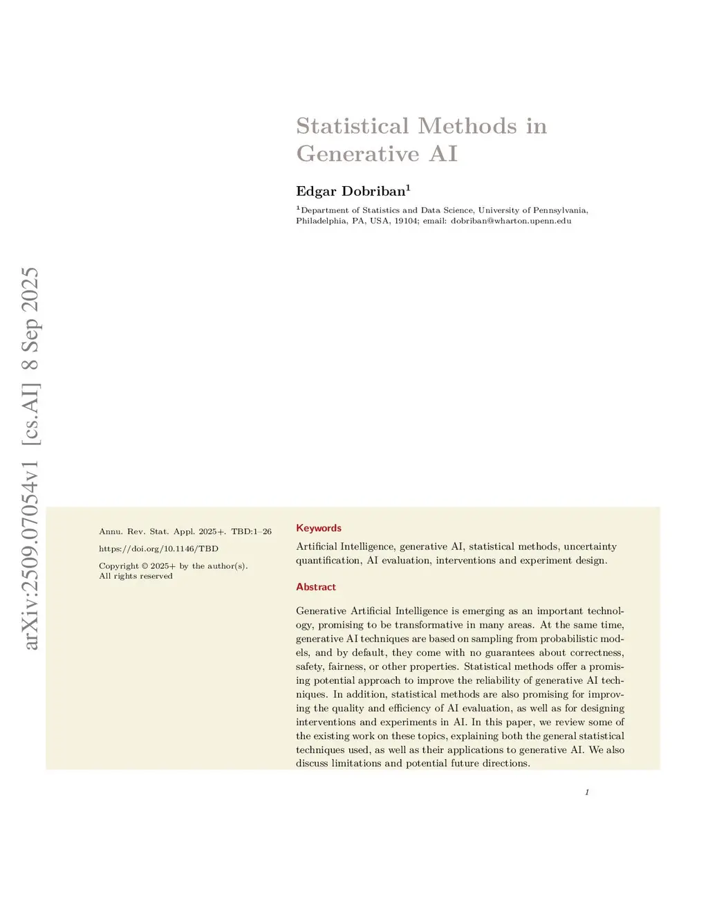 Generative Artificial Intelligence is emerging as an important technology, promising to be transformative in many areas. At the same time, generative AI techniques are based on sampling from probabilistic models, and by default, they come with no guarantees about correctness, safety, fairness, or other properties. Statistical methods offer a promising potential approach to improve the reliability of generative AI techniques. In addition, statistical methods are also promising for improving the quality and efficiency of AI evaluation, as well as for designing interventions and experiments in AI.