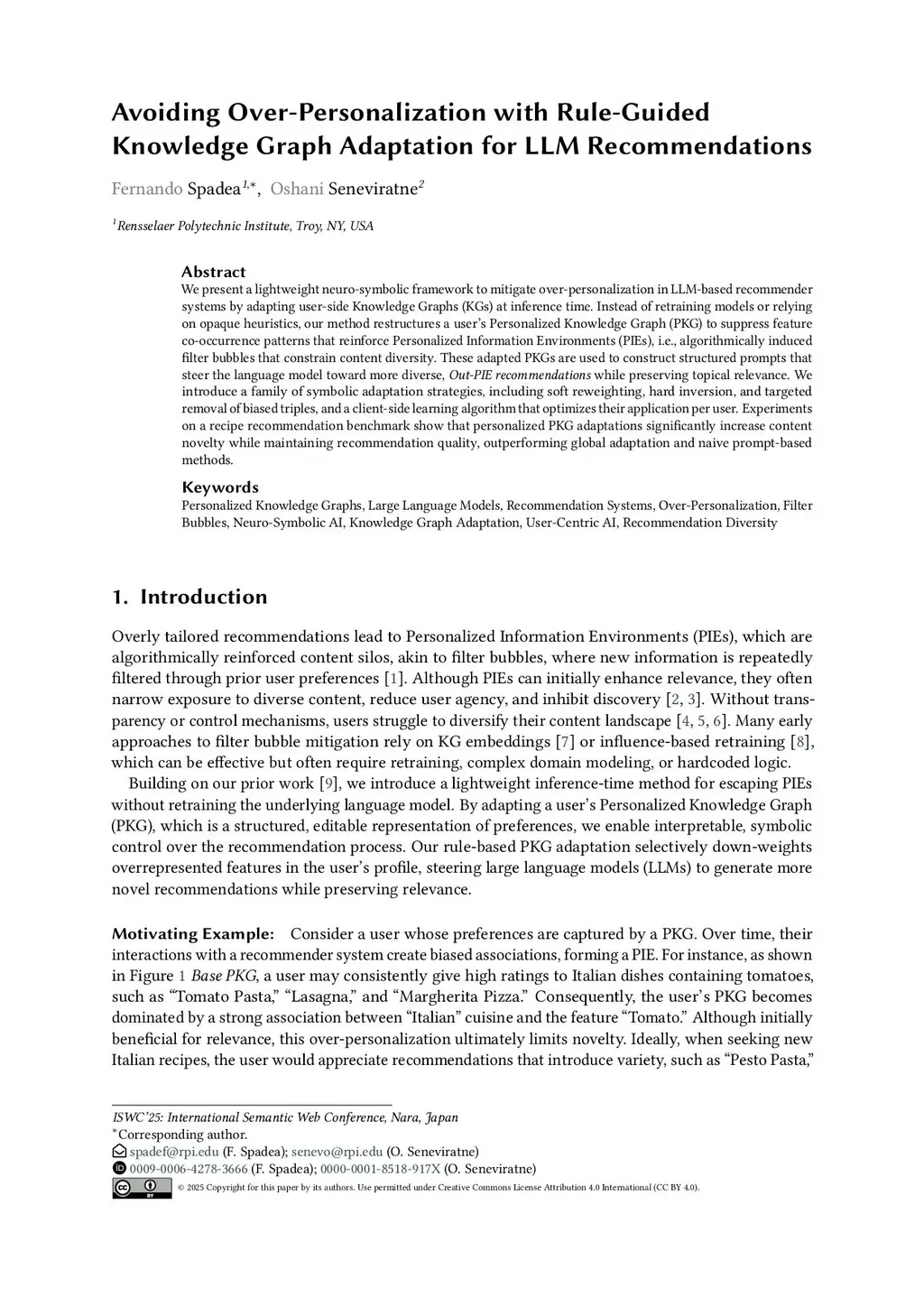 We present a lightweight neuro-symbolic framework to mitigate over-personalization in LLM-based recommender systems by adapting user-side Knowledge Graphs (KGs) at inference time. Instead of retraining models or relying on opaque heuristics, our method restructures a user's Personalized Knowledge Graph (PKG) to suppress feature co-occurrence patterns that reinforce Personalized Information Environments (PIEs), i.e., algorithmically induced filter bubbles that constrain content diversity. These adapted PKGs are used to construct structured prompts that steer the language model toward more diverse, Out-PIE recommendations while preserving topical relevance. We introduce a family of symbolic adaptation strategies, including soft reweighting, hard inversion, and targeted removal of biased triples, and a client-side learning algorithm that optimizes their application per user. Experiments on a recipe recommendation benchmark show that personalized PKG adaptations significantly increase content novelty while maintaining recommendation quality, outperforming global adaptation and naive prompt-based methods.