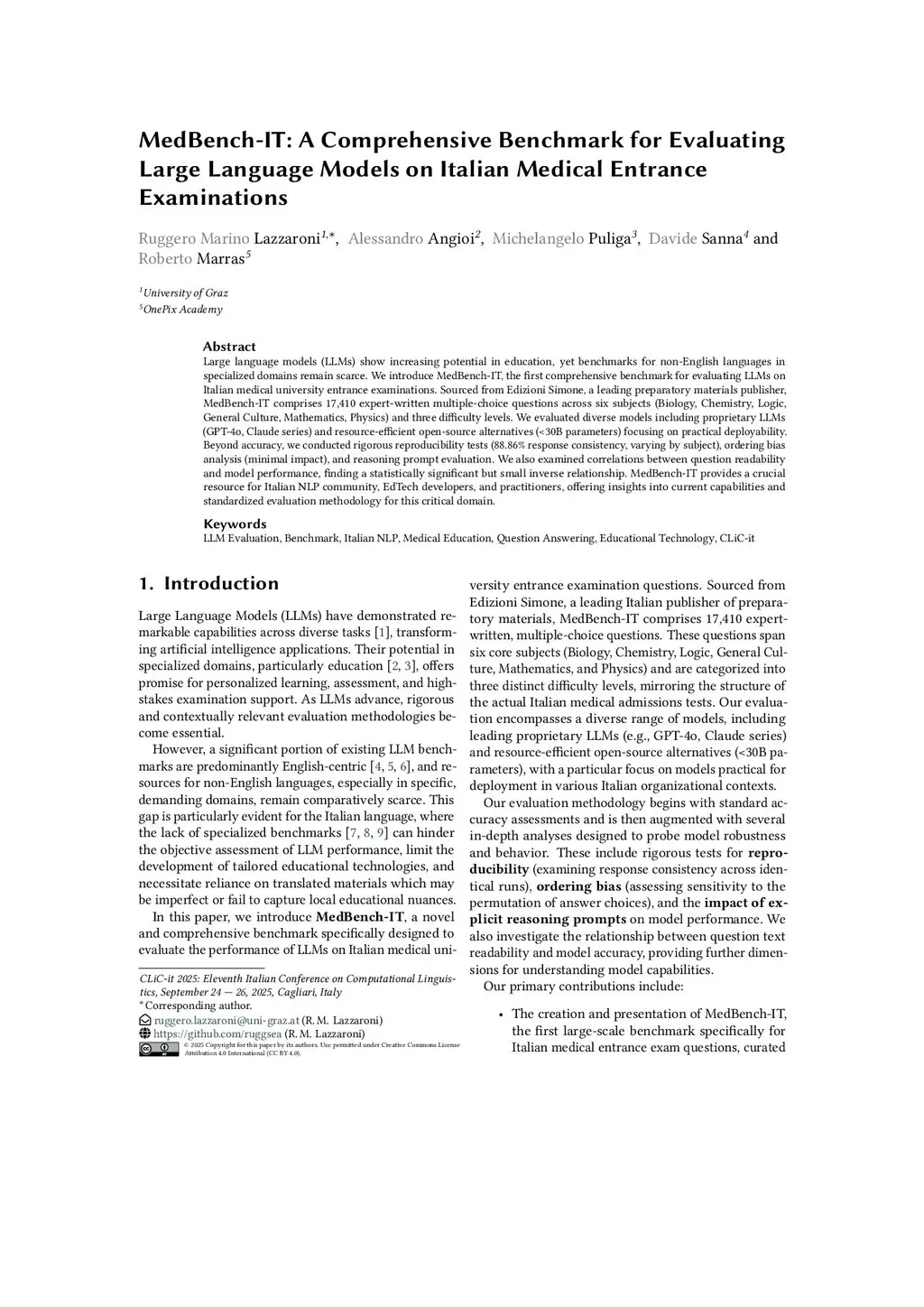 Large language models (LLMs) show increasing potential in education, yet benchmarks for non-English languages in specialized domains remain scarce. We introduce MedBench-IT, the first comprehensive benchmark for evaluating LLMs on Italian medical university entrance examinations. Sourced from Edizioni Simone, a leading preparatory materials publisher, MedBench-IT comprises 17,410 expert-written multiple-choice questions across six subjects (Biology, Chemistry, Logic, General Culture, Mathematics, Physics) and three difficulty levels. We evaluated diverse models including proprietary LLMs (GPT-4o, Claude series) and resource-efficient open-source alternatives (<30B parameters) focusing on practical deployability.Beyond accuracy, we conducted rigorous reproducibility tests (88.86% response consistency, varying by subject), ordering bias analysis (minimal impact), and reasoning prompt evaluation. We also examined correlations between question readability and model performance, finding a statistically significant but small inverse relationship. MedBench-IT provides a crucial resource for Italian NLP community, EdTech developers, and practitioners, offering insights into current capabilities and standardized evaluation methodology for this critical domain.
