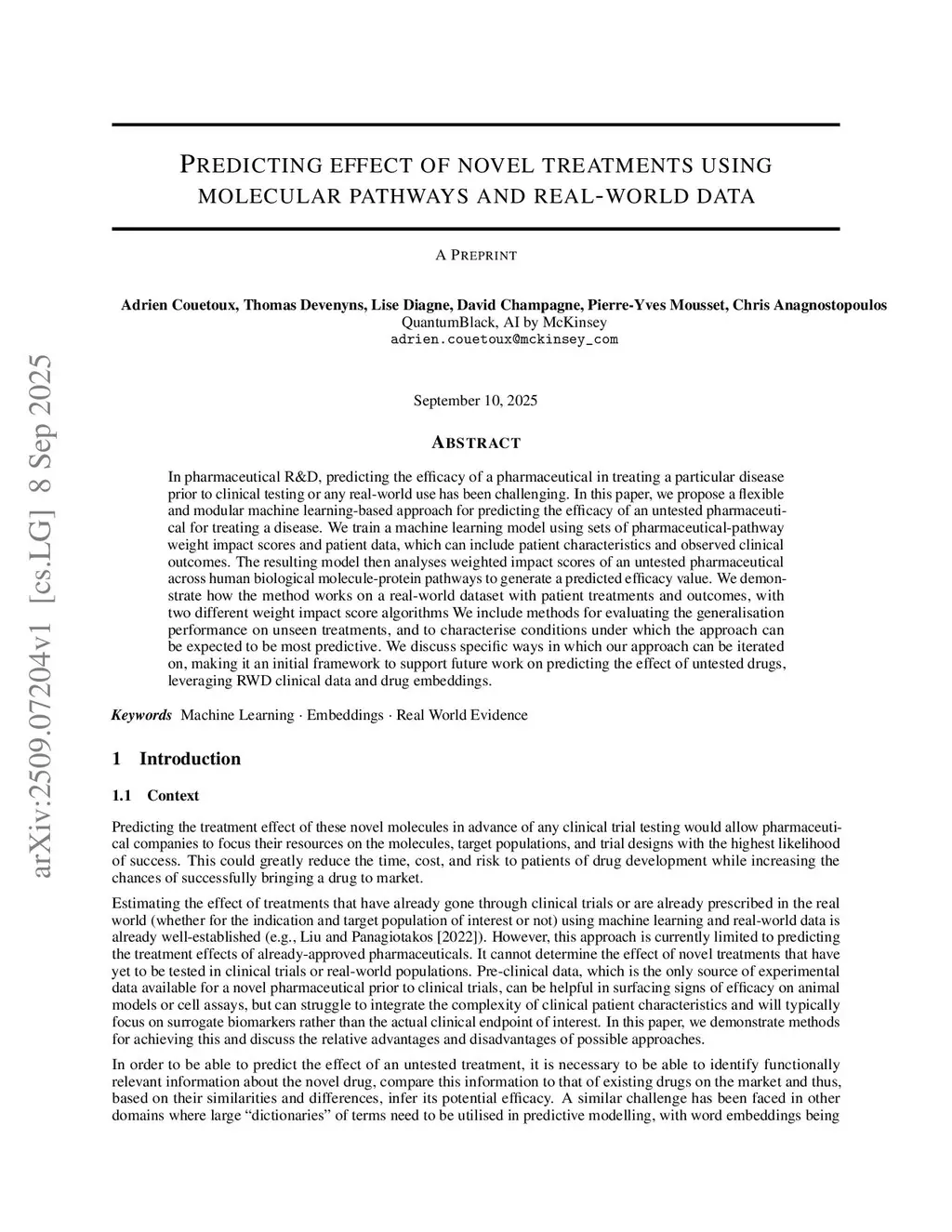 In pharmaceutical R&D, predicting the efficacy of a pharmaceutical in treating a particular disease prior to clinical testing or any real-world use has been challenging. In this paper, we propose a flexible and modular machine learning-based approach for predicting the efficacy of an untested pharmaceutical for treating a disease. We train a machine learning model using sets of pharmaceutical-pathway weight impact scores and patient data, which can include patient characteristics and observed clinical outcomes. The resulting model then analyses weighted impact scores of an untested pharmaceutical across human biological molecule-protein pathways to generate a predicted efficacy value. We demonstrate how the method works on a real-world dataset with patient treatments and outcomes, with two different weight impact score algorithms We include methods for evaluating the generalisation performance on unseen treatments, and to characterise conditions under which the approach can be expected to be most predictive. We discuss specific ways in which our approach can be iterated on, making it an initial framework to support future work on predicting the effect of untested drugs, leveraging RWD clinical data and drug embeddings.
