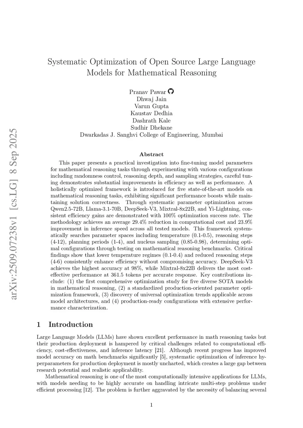 This paper presents a practical investigation into fine-tuning model parameters for mathematical reasoning tasks through experimenting with various configurations including randomness control, reasoning depth, and sampling strategies, careful tuning demonstrates substantial improvements in efficiency as well as performance. A holistically optimized framework is introduced for five state-of-the-art models on mathematical reasoning tasks, exhibiting significant performance boosts while maintaining solution correctness. Through systematic parameter optimization across Qwen2.5-72B, Llama-3.1-70B, DeepSeek-V3, Mixtral-8x22B, and Yi-Lightning, consistent efficiency gains are demonstrated with 100% optimization success rate. The methodology achieves an average 29.4% reduction in computational cost and 23.9% improvement in inference speed across all tested models. This framework systematically searches parameter spaces including temperature (0.1-0.5), reasoning steps (4-12), planning periods (1-4), and nucleus sampling (0.85-0.98), determining optimal configurations through testing on mathematical reasoning benchmarks. Critical findings show that lower temperature regimes (0.1-0.4) and reduced reasoning steps (4-6) consistently enhance efficiency without compromising accuracy. DeepSeek-V3 achieves the highest accuracy at 98%, while Mixtral-8x22B delivers the most cost-effective performance at 361.5 tokens per accurate response. Key contributions include: (1) the first comprehensive optimization study for five diverse SOTA models in mathematical reasoning, (2) a standardized production-oriented parameter optimization framework, (3) discovery of universal optimization trends applicable across model architectures, and (4) production-ready configurations with extensive performance characterization.