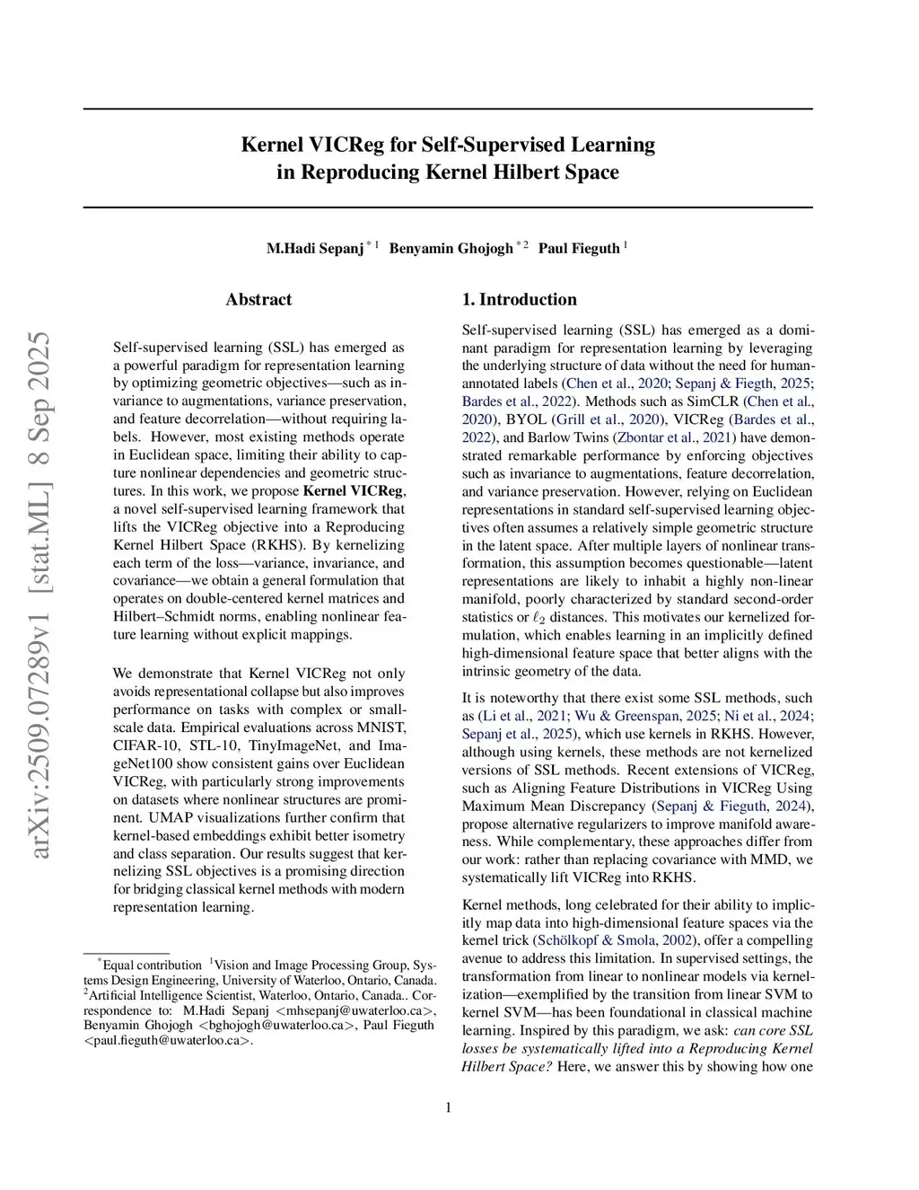 Self-supervised learning (SSL) has emerged as a powerful paradigm for representation learning by optimizing geometric objectives, such as invariance to augmentations, variance preservation, and feature decorrelation, without requiring labels. However, most existing methods operate in Euclidean space, limiting their ability to capture nonlinear dependencies and geometric structures. In this work, we propose Kernel VICReg, a novel self-supervised learning framework that pulls the VICReg objective into a Reproducing Kernel Hilbert Space (RKHS). By kernelizing each term of the loss, variance, invariance, and covariance, we obtain a general formulation that operates on double-centered kernel matrices and Hilbert--Schmidt norms, enabling nonlinear feature learning without explicit mappings. We demonstrate that Kernel VICReg mitigates the risk of representational collapse under challenging conditions and improves performance on datasets exhibiting nonlinear structure or limited sample regimes. Empirical evaluations across MNIST, CIFAR-10, STL-10, TinyImageNet, and ImageNet100 show consistent gains over Euclidean VICReg, with particularly strong improvements on datasets where nonlinear structures are prominent. UMAP visualizations are provided only as a qualitative illustration of embedding geometry and are not used as a calibration or statistical validation. Our results suggest that kernelizing SSL objectives is a promising direction for bridging classical kernel methods with modern representation learning.
