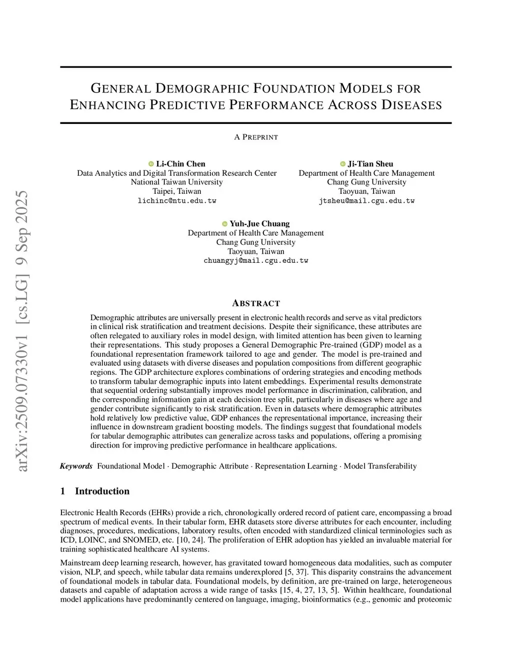 Demographic attributes are universally present in electronic health records. They are the most widespread information across populations and diseases, and serve as vital predictors in clinical risk stratification and treatment decisions. Despite their significance, these attributes are often treated as auxiliaries in model design, with limited attention being paid to learning their representations. This study explored the development of a General Demographic Pre-trained (GDP) model as a foundational model tailored to demographic attributes, focusing on age and gender. The model is pre-trained and evaluated using datasets with diverse diseases and populations compositions from different geographic regions. The composition of GDP architecture was explored through examining combinations of ordering approaches and encoding methods to transform tabular demographic inputs into effective latent embeddings. Results demonstrate the feasibility of GDP to generalize across task, diseases, and populations. In detailed composition, the sequential ordering substantially improves model performance in discrimination, calibration, and the corresponding information gain at each decision tree split, particularly in diseases where age and gender contribute significantly to risk stratification. Even in datasets where demographic attributes hold relatively low predictive value, GDP enhances the representational importance, increasing their influence in downstream gradient boosting models. The findings suggest that foundation models for tabular demographic attributes offer a promising direction for improving predictive performance in healthcare applications.