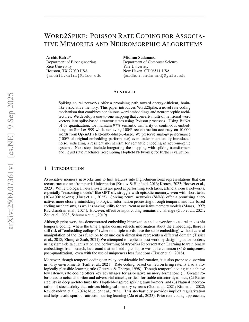 Spiking neural networks offer a promising path toward energy-efficient, brain-like associative memory. This paper introduces Word2Spike, a novel rate coding mechanism that combines continuous word embeddings and neuromorphic architectures. We develop a one-to-one mapping that converts multi-dimensional word vectors into spike-based attractor states using Poisson processes. Using BitNet b1.58 quantization, we maintain 97% semantic similarity of continuous embeddings on SimLex-999 while achieving 100% reconstruction accuracy on 10,000 words from OpenAI's text-embedding-3-large. We preserve analogy performance (100% of original embedding performance) even under intentionally introduced noise, indicating a resilient mechanism for semantic encoding in neuromorphic systems. Next steps include integrating the mapping with spiking transformers and liquid state machines (resembling Hopfield Networks) for further evaluation.