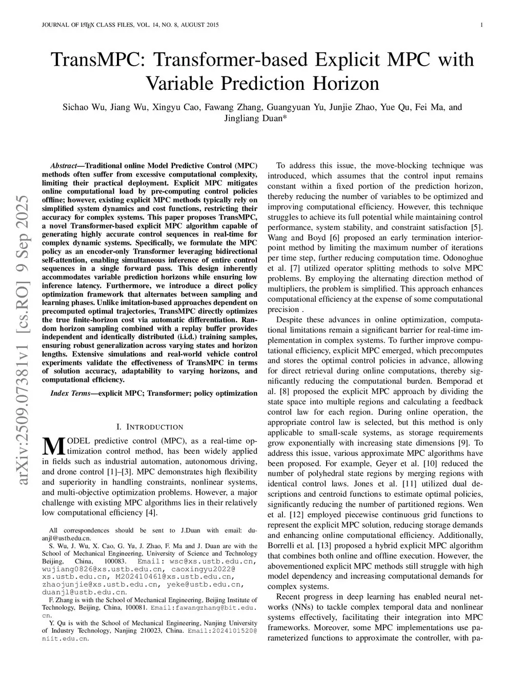 Traditional online Model Predictive Control (MPC) methods often suffer from excessive computational complexity, limiting their practical deployment. Explicit MPC mitigates online computational load by pre-computing control policies offline; however, existing explicit MPC methods typically rely on simplified system dynamics and cost functions, restricting their accuracy for complex systems. This paper proposes TransMPC, a novel Transformer-based explicit MPC algorithm capable of generating highly accurate control sequences in real-time for complex dynamic systems. Specifically, we formulate the MPC policy as an encoder-only Transformer leveraging bidirectional self-attention, enabling simultaneous inference of entire control sequences in a single forward pass. This design inherently accommodates variable prediction horizons while ensuring low inference latency. Furthermore, we introduce a direct policy optimization framework that alternates between sampling and learning phases. Unlike imitation-based approaches dependent on precomputed optimal trajectories, TransMPC directly optimizes the true finite-horizon cost via automatic differentiation. Random horizon sampling combined with a replay buffer provides independent and identically distributed (i.i.d.) training samples, ensuring robust generalization across varying states and horizon lengths. Extensive simulations and real-world vehicle control experiments validate the effectiveness of TransMPC in terms of solution accuracy, adaptability to varying horizons, and computational efficiency.