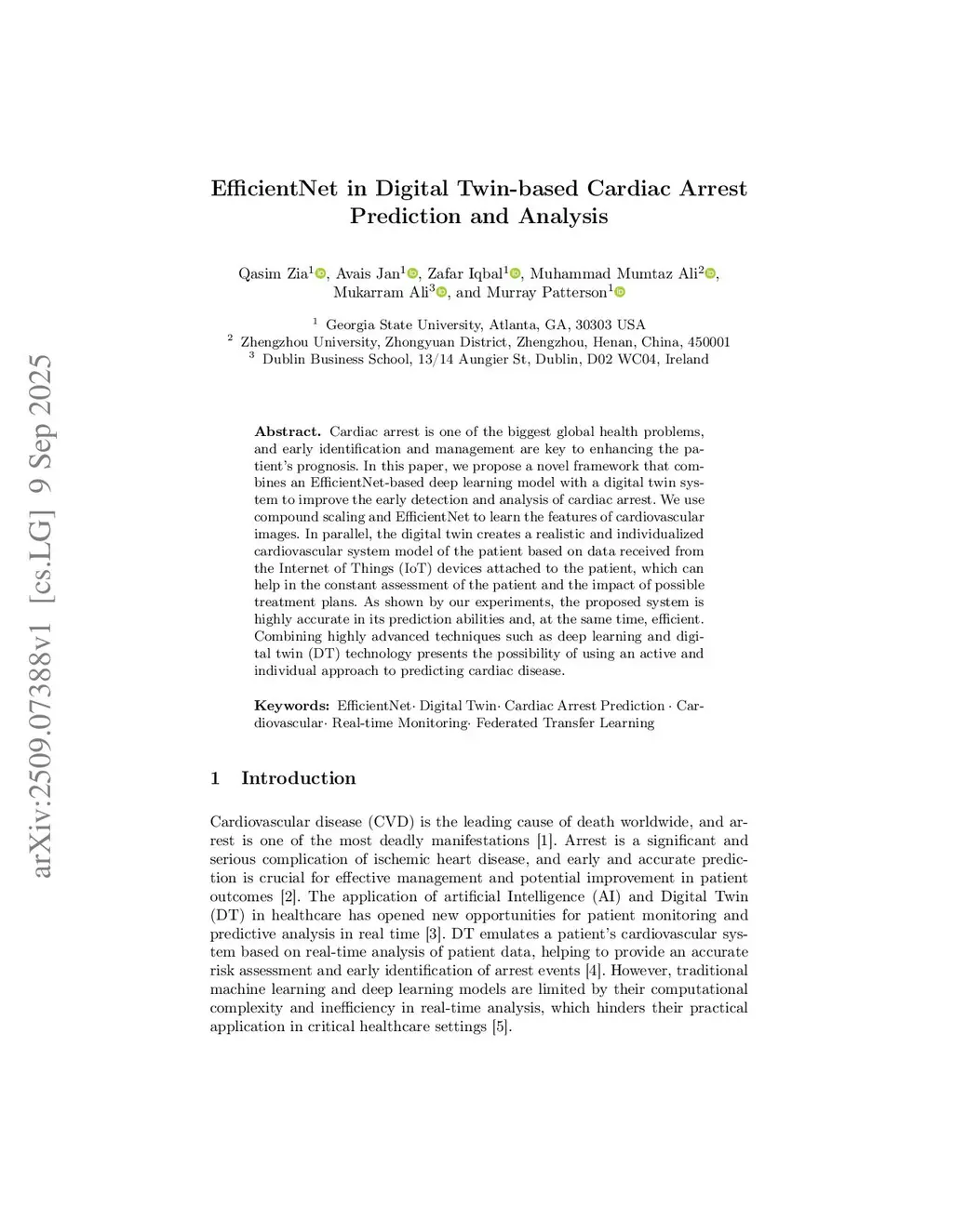 EfficientNet in Digital Twin-based Cardiac Arrest Prediction and Analysis