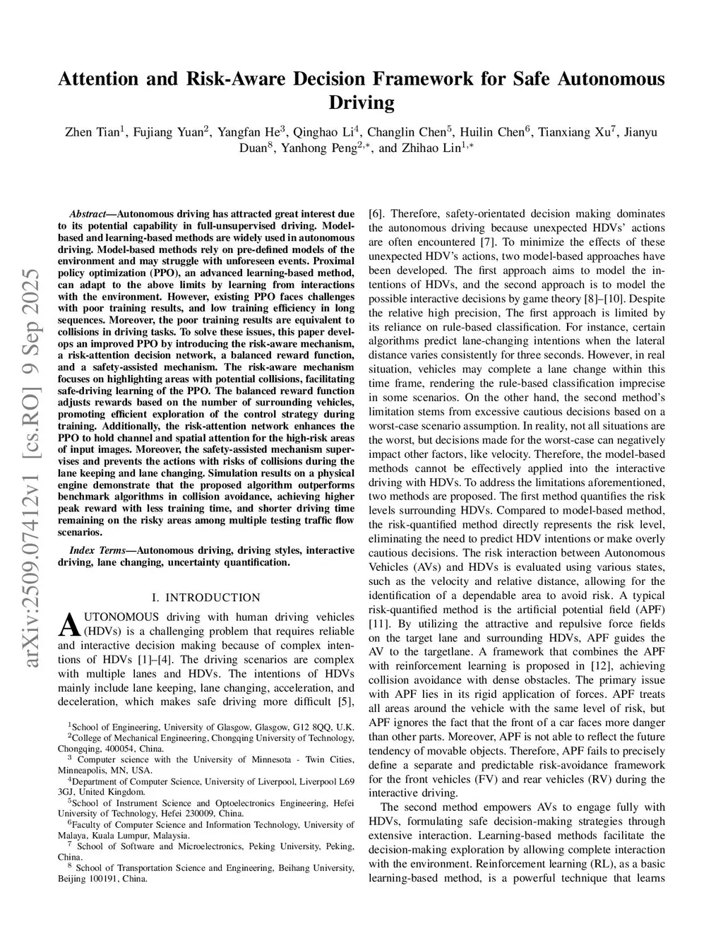 Autonomous driving has attracted great interest due to its potential capability in full-unsupervised driving. Model-based and learning-based methods are widely used in autonomous driving. Model-based methods rely on pre-defined models of the environment and may struggle with unforeseen events. Proximal policy optimization (PPO), an advanced learning-based method, can adapt to the above limits by learning from interactions with the environment. However, existing PPO faces challenges with poor training results, and low training efficiency in long sequences. Moreover, the poor training results are equivalent to collisions in driving tasks. To solve these issues, this paper develops an improved PPO by introducing the risk-aware mechanism, a risk-attention decision network, a balanced reward function, and a safety-assisted mechanism. The risk-aware mechanism focuses on highlighting areas with potential collisions, facilitating safe-driving learning of the PPO. The balanced reward function adjusts rewards based on the number of surrounding vehicles, promoting efficient exploration of the control strategy during training. Additionally, the risk-attention network enhances the PPO to hold channel and spatial attention for the high-risk areas of input images. Moreover, the safety-assisted mechanism supervises and prevents the actions with risks of collisions during the lane keeping and lane changing. Simulation results on a physical engine demonstrate that the proposed algorithm outperforms benchmark algorithms in collision avoidance, achieving higher peak reward with less training time, and shorter driving time remaining on the risky areas among multiple testing traffic flow scenarios.