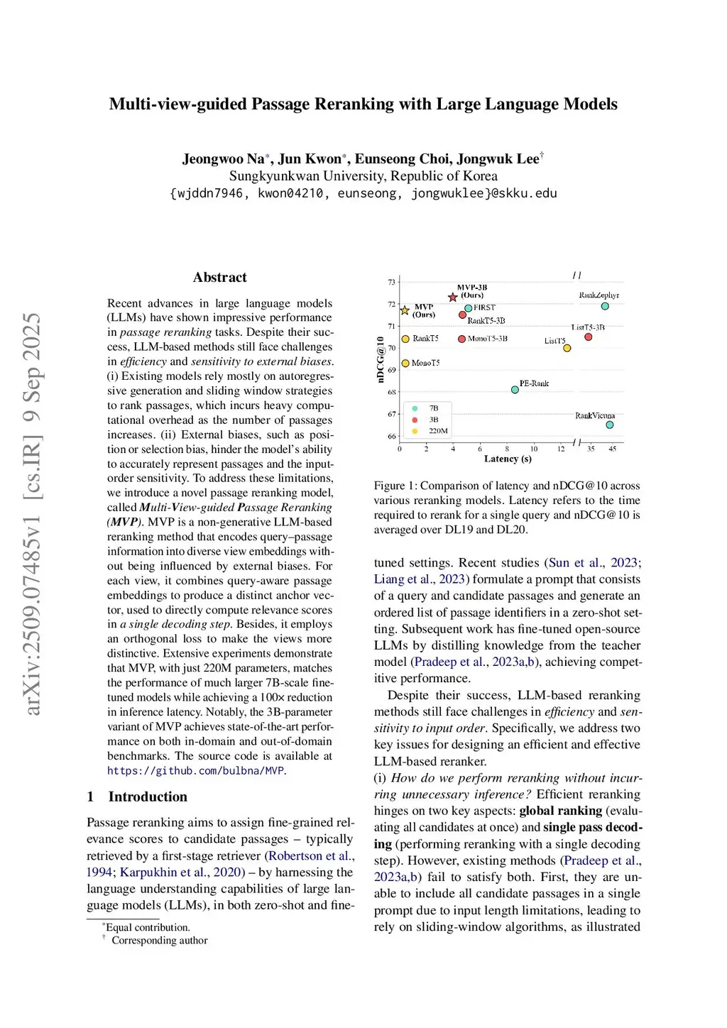 Recent advances in large language models (LLMs) have shown impressive performance in passage reranking tasks. Despite their success, LLM-based methods still face challenges in efficiency and sensitivity to external biases. (1) Existing models rely mostly on autoregressive generation and sliding window strategies to rank passages, which incur heavy computational overhead as the number of passages increases. (2) External biases, such as position or selection bias, hinder the model's ability to accurately represent passages and increase input-order sensitivity. To address these limitations, we introduce a novel passage reranking model, called Multi-View-guided Passage Reranking (MVP). MVP is a non-generative LLM-based reranking method that encodes query-passage information into diverse view embeddings without being influenced by external biases. For each view, it combines query-aware passage embeddings to produce a distinct anchor vector, which is then used to directly compute relevance scores in a single decoding step. In addition, it employs an orthogonal loss to make the views more distinctive. Extensive experiments demonstrate that MVP, with just 220M parameters, matches the performance of much larger 7B-scale fine-tuned models while achieving a 100x reduction in inference latency. Notably, the 3B-parameter variant of MVP achieves state-of-the-art performance on both in-domain and out-of-domain benchmarks. The source code is available at:this https URL
