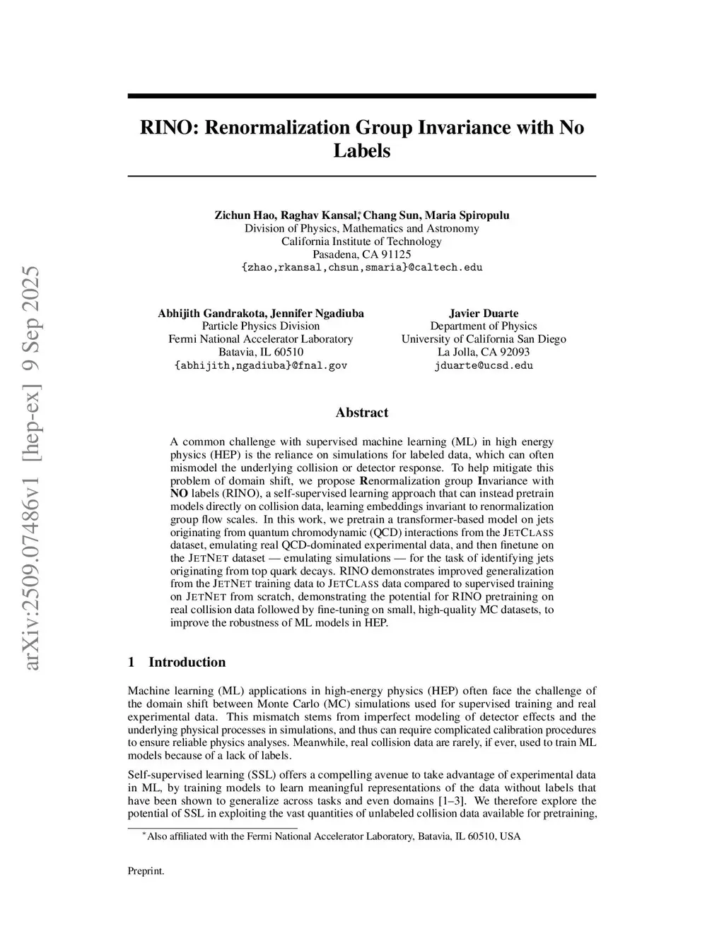 A common challenge with supervised machine learning (ML) in high energy physics (HEP) is the reliance on simulations for labeled data, which can often mismodel the underlying collision or detector response. To help mitigate this problem of domain shift, we propose RINO (Renormalization Group Invariance with No Labels), a self-supervised learning approach that can instead pretrain models directly on collision data, learning embeddings invariant to renormalization group flow scales. In this work, we pretrain a transformer-based model on jets originating from quantum chromodynamic (QCD) interactions from the JetClass dataset, emulating real QCD-dominated experimental data, and then finetune on the JetNet dataset -- emulating simulations -- for the task of identifying jets originating from top quark decays. RINO demonstrates improved generalization from the JetNet training data to JetClass data compared to supervised training on JetNet from scratch, demonstrating the potential for RINO pretraining on real collision data followed by fine-tuning on small, high-quality MC datasets, to improve the robustness of ML models in HEP.