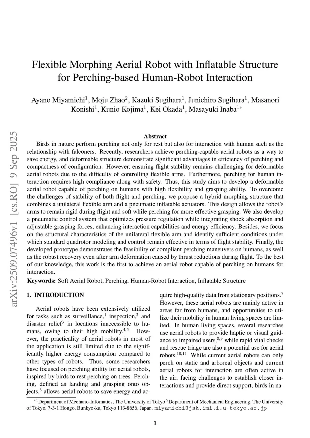 Birds in nature perform perching not only for rest but also for interaction with human such as the relationship with falconers. Recently, researchers achieve perching-capable aerial robots as a way to save energy, and deformable structure demonstrate significant advantages in efficiency of perching and compactness of configuration. However, ensuring flight stability remains challenging for deformable aerial robots due to the difficulty of controlling flexible arms. Furthermore, perching for human interaction requires high compliance along with safety. Thus, this study aims to develop a deformable aerial robot capable of perching on humans with high flexibility and grasping ability. To overcome the challenges of stability of both flight and perching, we propose a hybrid morphing structure that combines a unilateral flexible arm and a pneumatic inflatable actuators. This design allows the robot's arms to remain rigid during flight and soft while perching for more effective grasping. We also develop a pneumatic control system that optimizes pressure regulation while integrating shock absorption and adjustable grasping forces, enhancing interaction capabilities and energy efficiency. Besides, we focus on the structural characteristics of the unilateral flexible arm and identify sufficient conditions under which standard quadrotor modeling and control remain effective in terms of flight stability. Finally, the developed prototype demonstrates the feasibility of compliant perching maneuvers on humans, as well as the robust recovery even after arm deformation caused by thrust reductions during flight. To the best of our knowledge, this work is the first to achieve an aerial robot capable of perching on humans for interaction.