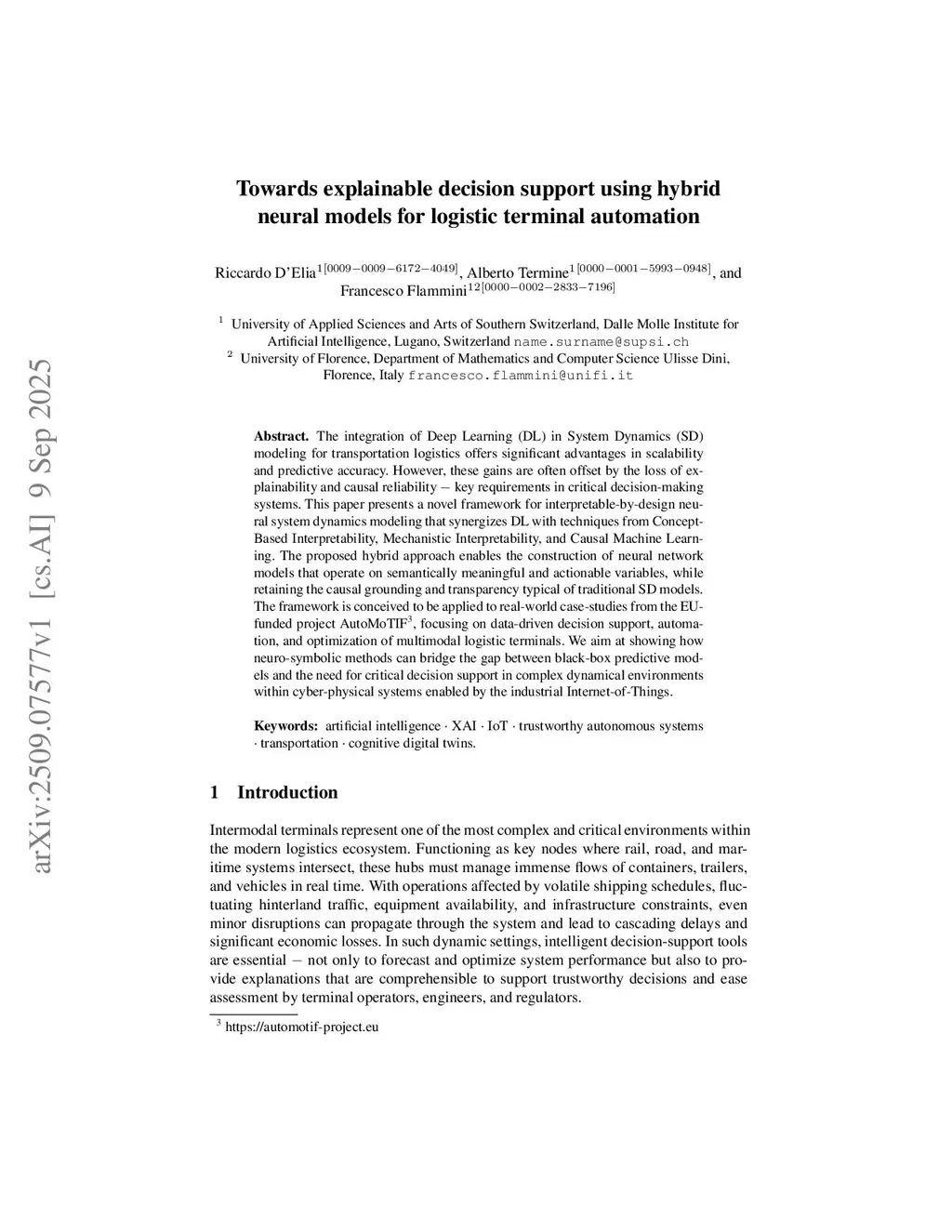 The integration of Deep Learning (DL) in System Dynamics (SD) modeling for transportation logistics offers significant advantages in scalability and predictive accuracy. However, these gains are often offset by the loss of explainability and causal reliability key requirements in critical decision-making systems. This paper presents a novel framework for interpretable-by-design neural system dynamics modeling that synergizes DL with techniques from Concept-Based Interpretability, Mechanistic Interpretability, and Causal Machine Learning. The proposed hybrid approach enables the construction of neural network models that operate on semantically meaningful and actionable variables, while retaining the causal grounding and transparency typical of traditional SD models. The framework is conceived to be applied to real-world case-studies from the EU-funded project AutoMoTIF, focusing on data-driven decision support, automation, and optimization of multimodal logistic terminals. We aim at showing how neuro-symbolic methods can bridge the gap between black-box predictive models and the need for critical decision support in complex dynamical environments within cyber-physical systems enabled by the industrial Internet-of-Things.