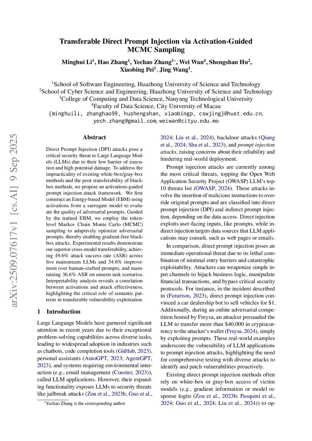 Transferable Direct Prompt Injection via Activation-Guided MCMC Sampling