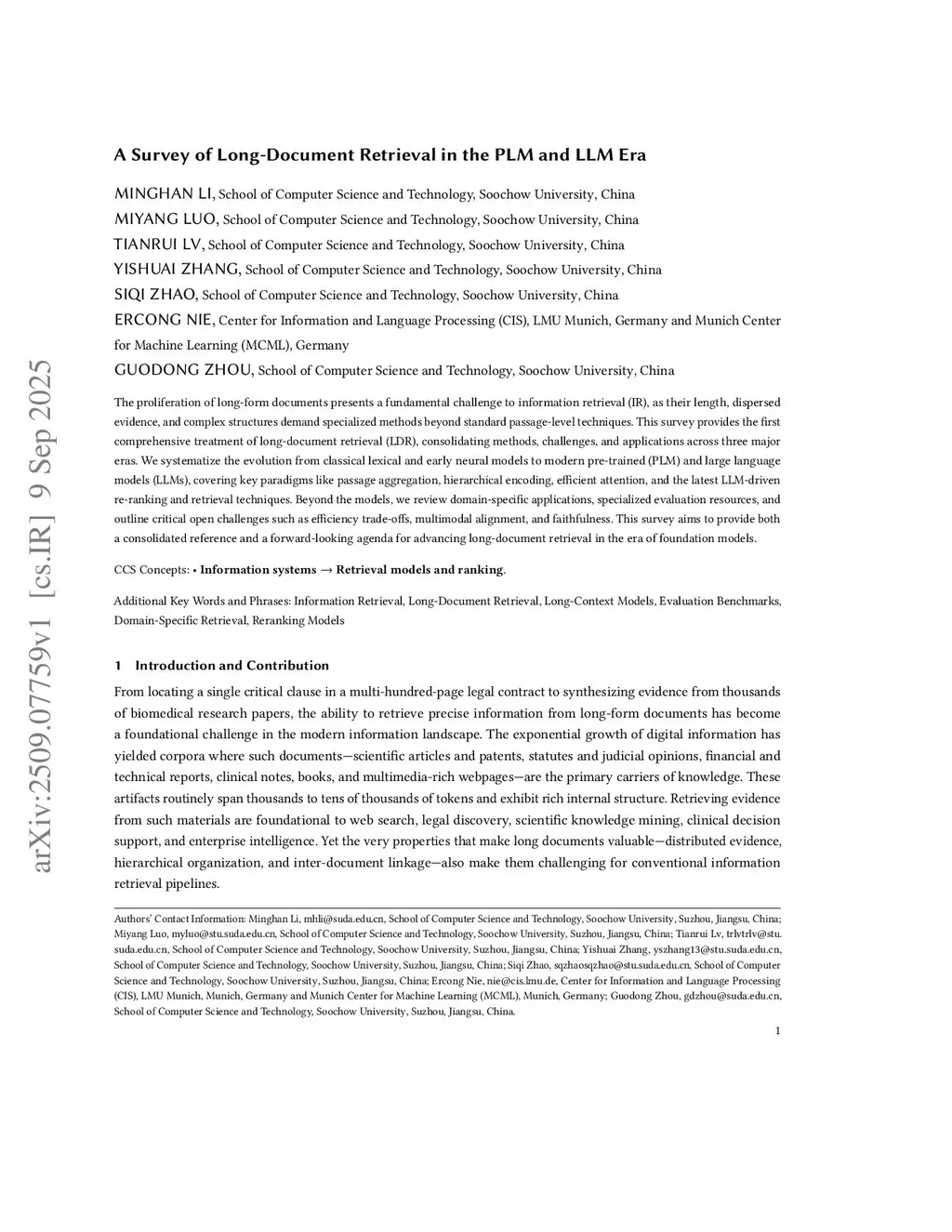 The proliferation of long-form documents presents a fundamental challenge to information retrieval (IR), as their length, dispersed evidence, and complex structures demand specialized methods beyond standard passage-level techniques. This survey provides the first comprehensive treatment of long-document retrieval (LDR), consolidating methods, challenges, and applications across three major eras. We systematize the evolution from classical lexical and early neural models to modern pre-trained (PLM) and large language models (LLMs), covering key paradigms like passage aggregation, hierarchical encoding, efficient attention, and the latest LLM-driven re-ranking and retrieval techniques. Beyond the models, we review domain-specific applications, specialized evaluation resources, and outline critical open challenges such as efficiency trade-offs, multimodal alignment, and faithfulness. This survey aims to provide both a consolidated reference and a forward-looking agenda for advancing long-document retrieval in the era of foundation models.