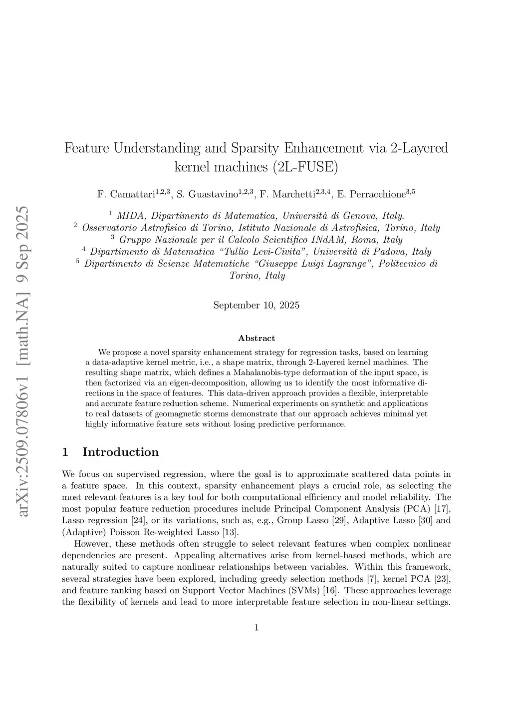 We propose a novel sparsity enhancement strategy for regression tasks, based on learning a data-adaptive kernel metric, i.e., a shape matrix, through 2-Layered kernel machines. The resulting shape matrix, which defines a Mahalanobis-type deformation of the input space, is then factorized via an eigen-decomposition, allowing us to identify the most informative directions in the space of features. This data-driven approach provides a flexible, interpretable and accurate feature reduction scheme. Numerical experiments on synthetic and applications to real datasets of geomagnetic storms demonstrate that our approach achieves minimal yet highly informative feature sets without losing predictive performance.