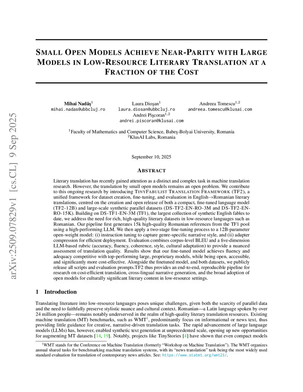 Literary translation has recently gained attention as a distinct and complex task in machine translation research. However, the translation by small open models remains an open problem. We contribute to this ongoing research by introducing TINYFABULIST TRANSLATION FRAMEWORK (TF2), a unified framework for dataset creation, fine-tuning, and evaluation in English-Romanian literary translations, centred on the creation and open release of both a compact, fine-tuned language model (TF2-12B) and large-scale synthetic parallel datasets (DS-TF2-EN-RO-3M and DS-TF2-EN-RO-15K). Building on DS-TF1-EN-3M (TF1), the largest collection of synthetic English fables to date, we address the need for rich, high-quality literary datasets in low-resource languages such as Romanian. Our pipeline first generates 15k high-quality Romanian references from the TF1 pool using a high-performing LLM. We then apply a two-stage fine-tuning process to a 12B-parameter open-weight model: (i) instruction tuning to capture genre-specific narrative style, and (ii) adapter compression for efficient deployment. Evaluation combines corpus-level BLEU and a five-dimension LLM-based rubric (accuracy, fluency, coherence, style, cultural adaptation) to provide a nuanced assessment of translation quality. Results show that our fine-tuned model achieves strong fluency and adequacy, narrowing the gap to top-performing proprietary models under automated and human-anchored evaluation, while being open, accessible, and significantly more cost-effective. Alongside the finetuned model, and both datasets, we publicly release all scripts and evaluation prompts. TF2 thus provides an end-to-end, reproducible pipeline for research on cost-efficient translation, cross-lingual narrative generation, and the broad adoption of open models for culturally significant literary content in low-resource settings.