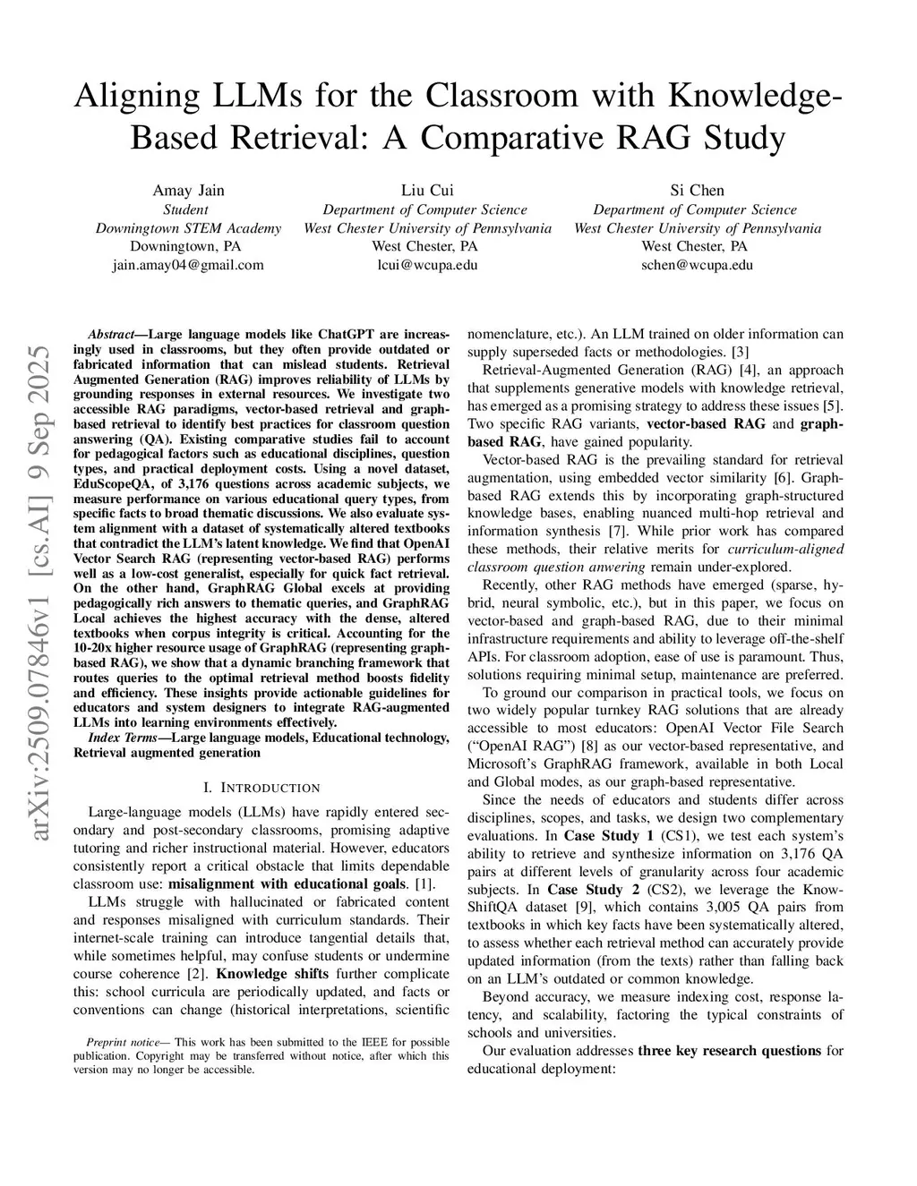 Large language models like ChatGPT are increasingly used in classrooms, but they often provide outdated or fabricated information that can mislead students. Retrieval Augmented Generation (RAG) improves reliability of LLMs by grounding responses in external resources. We investigate two accessible RAG paradigms, vector-based retrieval and graph-based retrieval to identify best practices for classroom question answering (QA). Existing comparative studies fail to account for pedagogical factors such as educational disciplines, question types, and practical deployment costs. Using a novel dataset, EduScopeQA, of 3,176 questions across academic subjects, we measure performance on various educational query types, from specific facts to broad thematic discussions. We also evaluate system alignment with a dataset of systematically altered textbooks that contradict the LLM's latent knowledge. We find that OpenAI Vector Search RAG (representing vector-based RAG) performs well as a low-cost generalist, especially for quick fact retrieval. On the other hand, GraphRAG Global excels at providing pedagogically rich answers to thematic queries, and GraphRAG Local achieves the highest accuracy with the dense, altered textbooks when corpus integrity is critical. Accounting for the 10-20x higher resource usage of GraphRAG (representing graph-based RAG), we show that a dynamic branching framework that routes queries to the optimal retrieval method boosts fidelity and efficiency. These insights provide actionable guidelines for educators and system designers to integrate RAG-augmented LLMs into learning environments effectively.