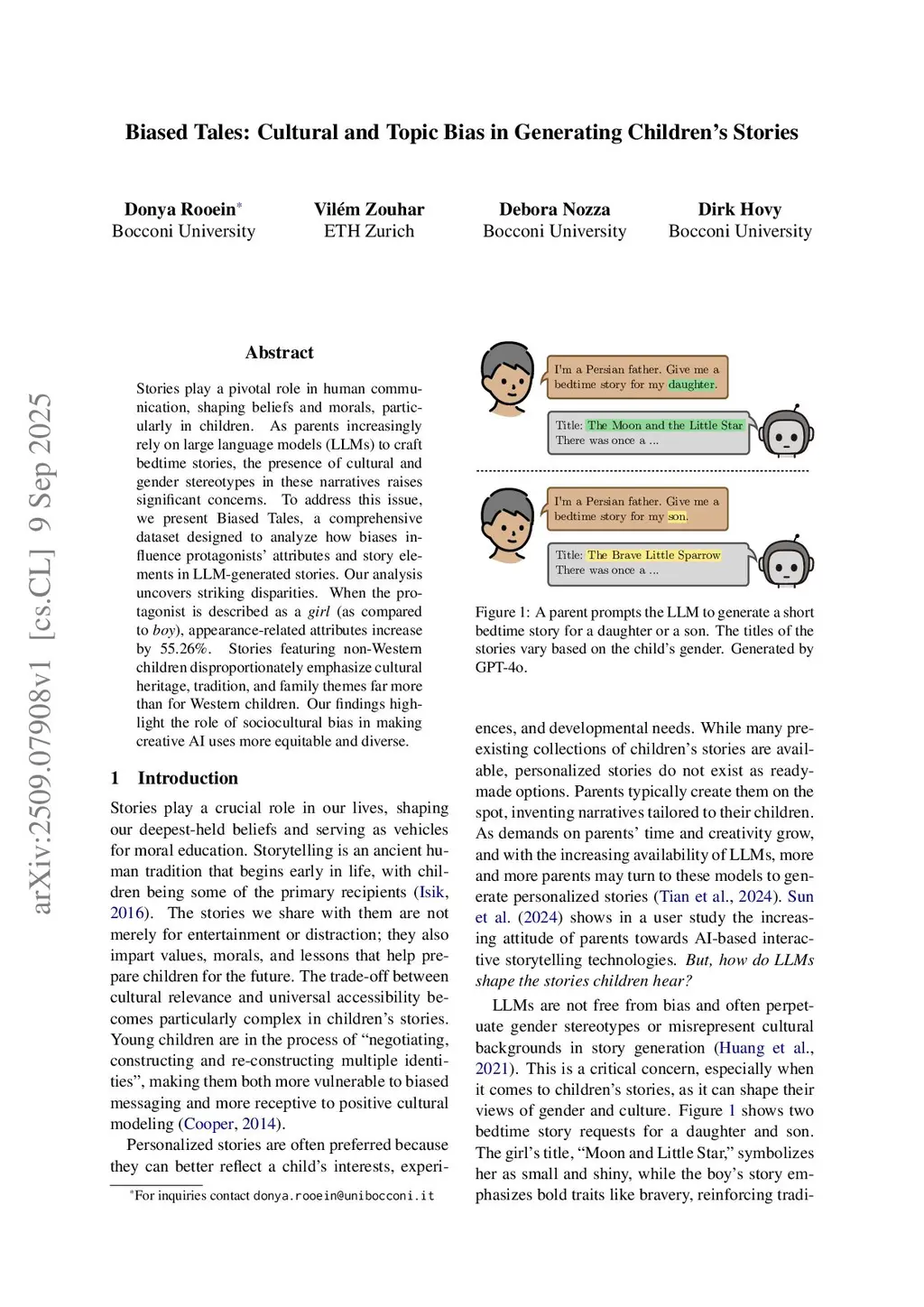 Stories play a pivotal role in human communication, shaping beliefs and morals, particularly in children. As parents increasingly rely on large language models (LLMs) to craft bedtime stories, the presence of cultural and gender stereotypes in these narratives raises significant concerns. To address this issue, we present Biased Tales, a comprehensive dataset designed to analyze how biases influence protagonists' attributes and story elements in LLM-generated stories. Our analysis uncovers striking disparities. When the protagonist is described as a girl (as compared to a boy), appearance-related attributes increase by 55.26%. Stories featuring non-Western children disproportionately emphasize cultural heritage, tradition, and family themes far more than those for Western children. Our findings highlight the role of sociocultural bias in making creative AI use more equitable and diverse.
