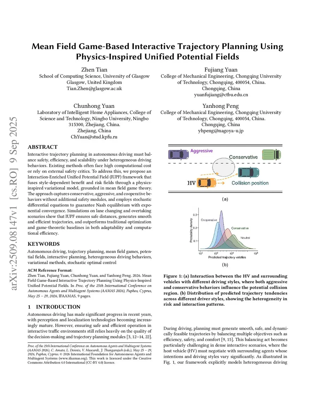 Interactive trajectory planning in autonomous driving must balance safety, efficiency, and scalability under heterogeneous driving behaviors. Existing methods often face high computational cost or rely on external safety critics. To address this, we propose an Interaction-Enriched Unified Potential Field (IUPF) framework that fuses style-dependent benefit and risk fields through a physics-inspired variational model, grounded in mean field game theory. The approach captures conservative, aggressive, and cooperative behaviors without additional safety modules, and employs stochastic differential equations to guarantee Nash equilibrium with exponential convergence. Simulations on lane changing and overtaking scenarios show that IUPF ensures safe distances, generates smooth and efficient trajectories, and outperforms traditional optimization and game-theoretic baselines in both adaptability and computational efficiency.