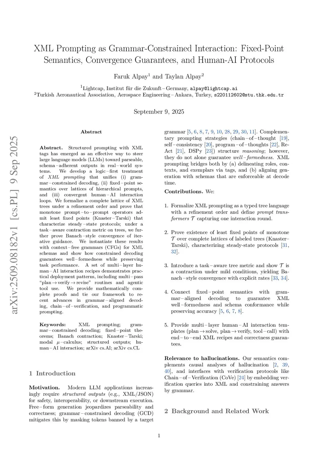 Structured prompting with XML tags has emerged as an effective way to steer large language models (LLMs) toward parseable, schema-adherent outputs in real-world systems. We develop a logic-first treatment of XML prompting that unifies (i) grammar-constrained decoding, (ii) fixed-point semantics over lattices of hierarchical prompts, and (iii) convergent human-AI interaction loops. We formalize a complete lattice of XML trees under a refinement order and prove that monotone prompt-to-prompt operators admit least fixed points (Knaster-Tarski) that characterize steady-state protocols; under a task-aware contraction metric on trees, we further prove Banach-style convergence of iterative guidance. We instantiate these results with context-free grammars (CFGs) for XML schemas and show how constrained decoding guarantees well-formedness while preserving task performance. A set of multi-layer human-AI interaction recipes demonstrates practical deployment patterns, including multi-pass "plan verify revise" routines and agentic tool use. We provide mathematically complete proofs and tie our framework to recent advances in grammar-aligned decoding, chain-of-verification, and programmatic prompting.