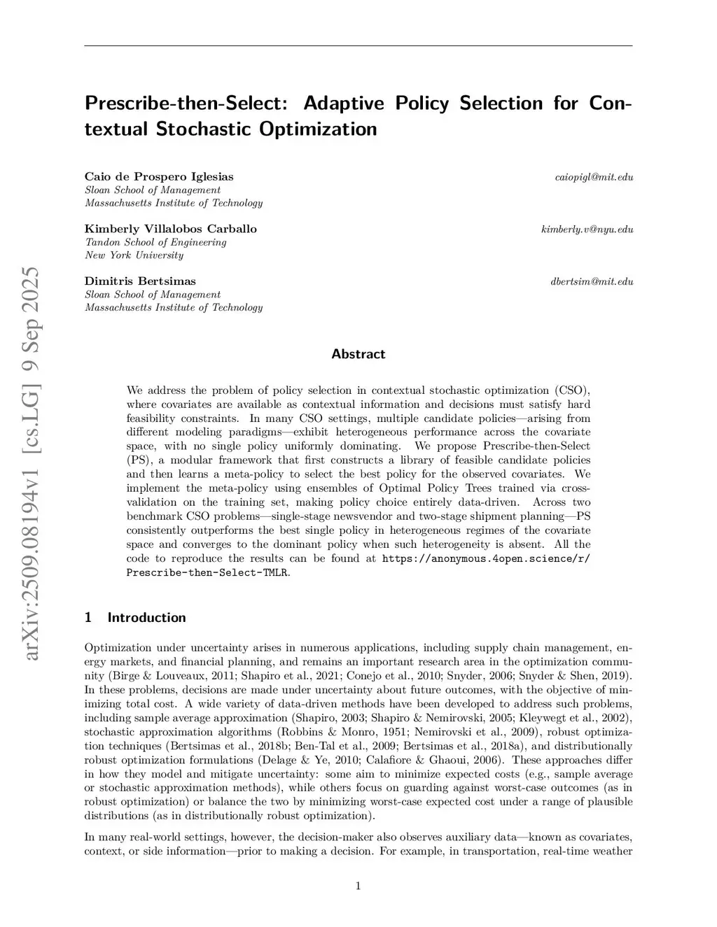 We address the problem of policy selection in contextual stochastic optimization (CSO), where covariates are available as contextual information and decisions must satisfy hard feasibility constraints. In many CSO settings, multiple candidate policies--arising from different modeling paradigms--exhibit heterogeneous performance across the covariate space, with no single policy uniformly dominating. We propose Prescribe-then-Select (PS), a modular framework that first constructs a library of feasible candidate policies and then learns a meta-policy to select the best policy for the observed covariates. We implement the meta-policy using ensembles of Optimal Policy Trees trained via cross-validation on the training set, making policy choice entirely data-driven. Across two benchmark CSO problems--single-stage newsvendor and two-stage shipment planning--PS consistently outperforms the best single policy in heterogeneous regimes of the covariate space and converges to the dominant policy when such heterogeneity is absent. All the code to reproduce the results can be found atthis https URL.