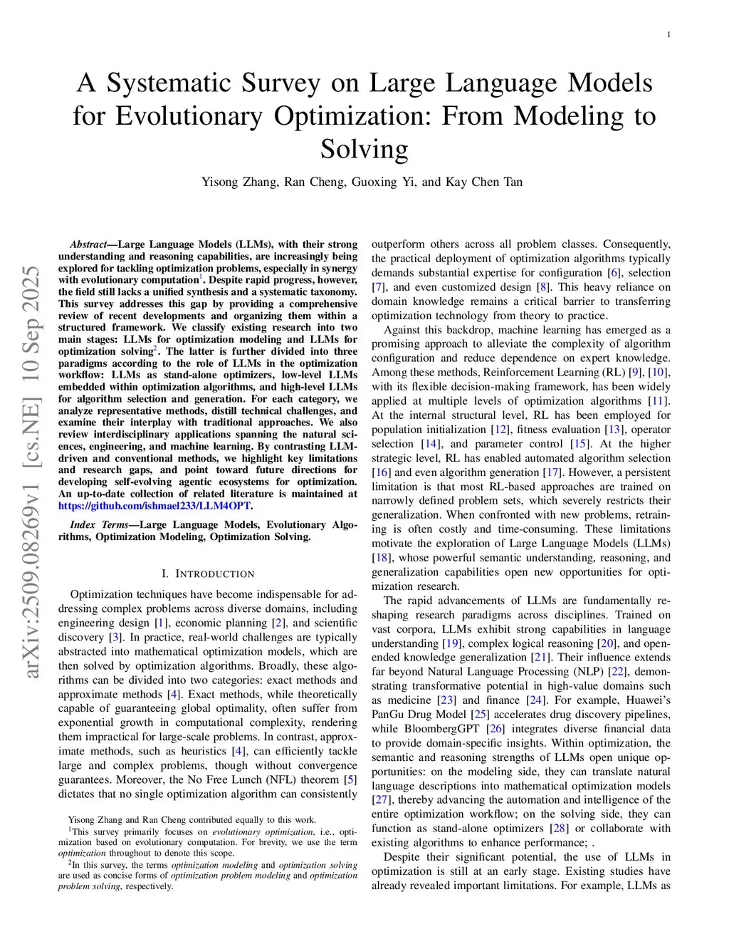 Large Language Models (LLMs), with their strong understanding and reasoning capabilities, are increasingly being explored for tackling optimization problems, especially in synergy with evolutionary computation. Despite rapid progress, however, the field still lacks a unified synthesis and a systematic taxonomy. This survey addresses this gap by providing a comprehensive review of recent developments and organizing them within a structured framework. We classify existing research into two main stages: LLMs for optimization modeling and LLMs for optimization solving. The latter is further divided into three paradigms according to the role of LLMs in the optimization workflow: LLMs as stand-alone optimizers, low-level LLMs embedded within optimization algorithms, and high-level LLMs for algorithm selection and generation. For each category, we analyze representative methods, distill technical challenges, and examine their interplay with traditional approaches. We also review interdisciplinary applications spanning the natural sciences, engineering, and machine learning. By contrasting LLM-driven and conventional methods, we highlight key limitations and research gaps, and point toward future directions for developing self-evolving agentic ecosystems for optimization. An up-to-date collection of related literature is maintained at this https URL.