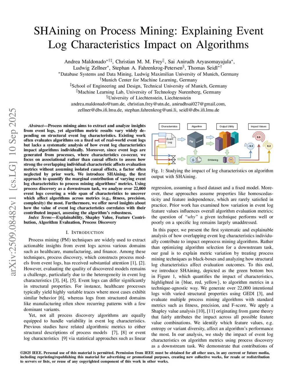 Process mining aims to extract and analyze insights from event logs, yet algorithm metric results vary widely depending on structural event log characteristics. Existing work often evaluates algorithms on a fixed set of real-world event logs but lacks a systematic analysis of how event log characteristics impact algorithms individually. Moreover, since event logs are generated from processes, where characteristics co-occur, we focus on associational rather than causal effects to assess how strong the overlapping individual characteristic affects evaluation metrics without assuming isolated causal effects, a factor often neglected by prior work. We introduce SHAining, the first approach to quantify the marginal contribution of varying event log characteristics to process mining algorithms' metrics. Using process discovery as a downstream task, we analyze over 22,000 event logs covering a wide span of characteristics to uncover which affect algorithms across metrics (e.g., fitness, precision, complexity) the most. Furthermore, we offer novel insights about how the value of event log characteristics correlates with their contributed impact, assessing the algorithm's robustness.