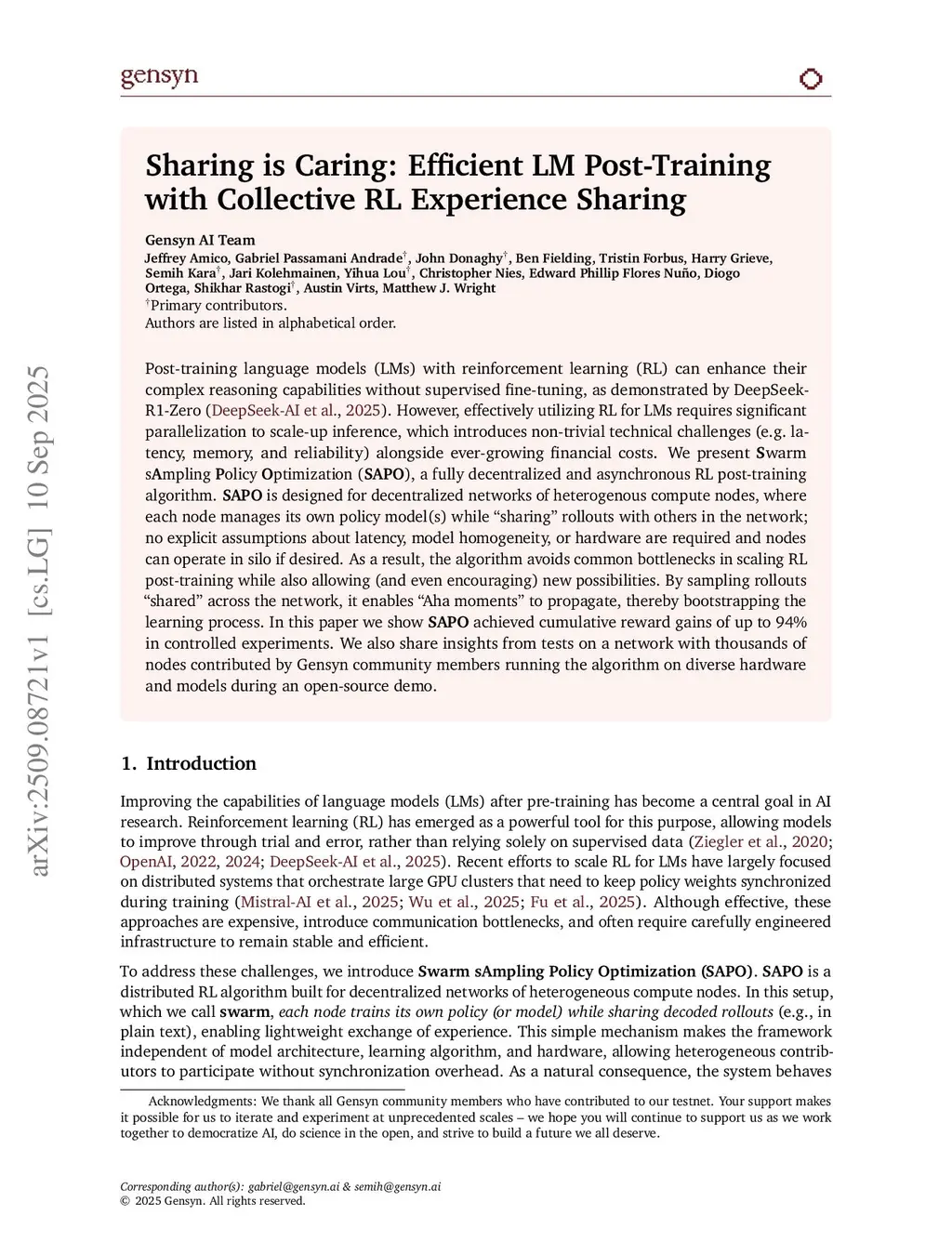 Post-training language models (LMs) with reinforcement learning (RL) can enhance their complex reasoning capabilities without supervised fine-tuning, as demonstrated by DeepSeek-R1-Zero. However, effectively utilizing RL for LMs requires significant parallelization to scale-up inference, which introduces non-trivial technical challenges (e.g. latency, memory, and reliability) alongside ever-growing financial costs. We present Swarm sAmpling Policy Optimization (SAPO), a fully decentralized and asynchronous RL post-training algorithm. SAPO is designed for decentralized networks of heterogenous compute nodes, where each node manages its own policy model(s) while "sharing" rollouts with others in the network; no explicit assumptions about latency, model homogeneity, or hardware are required and nodes can operate in silo if desired. As a result, the algorithm avoids common bottlenecks in scaling RL post-training while also allowing (and even encouraging) new possibilities. By sampling rollouts "shared" across the network, it enables "Aha moments" to propagate, thereby bootstrapping the learning process. In this paper we show SAPO achieved cumulative reward gains of up to 94% in controlled experiments. We also share insights from tests on a network with thousands of nodes contributed by Gensyn community members running the algorithm on diverse hardware and models during an open-source demo.