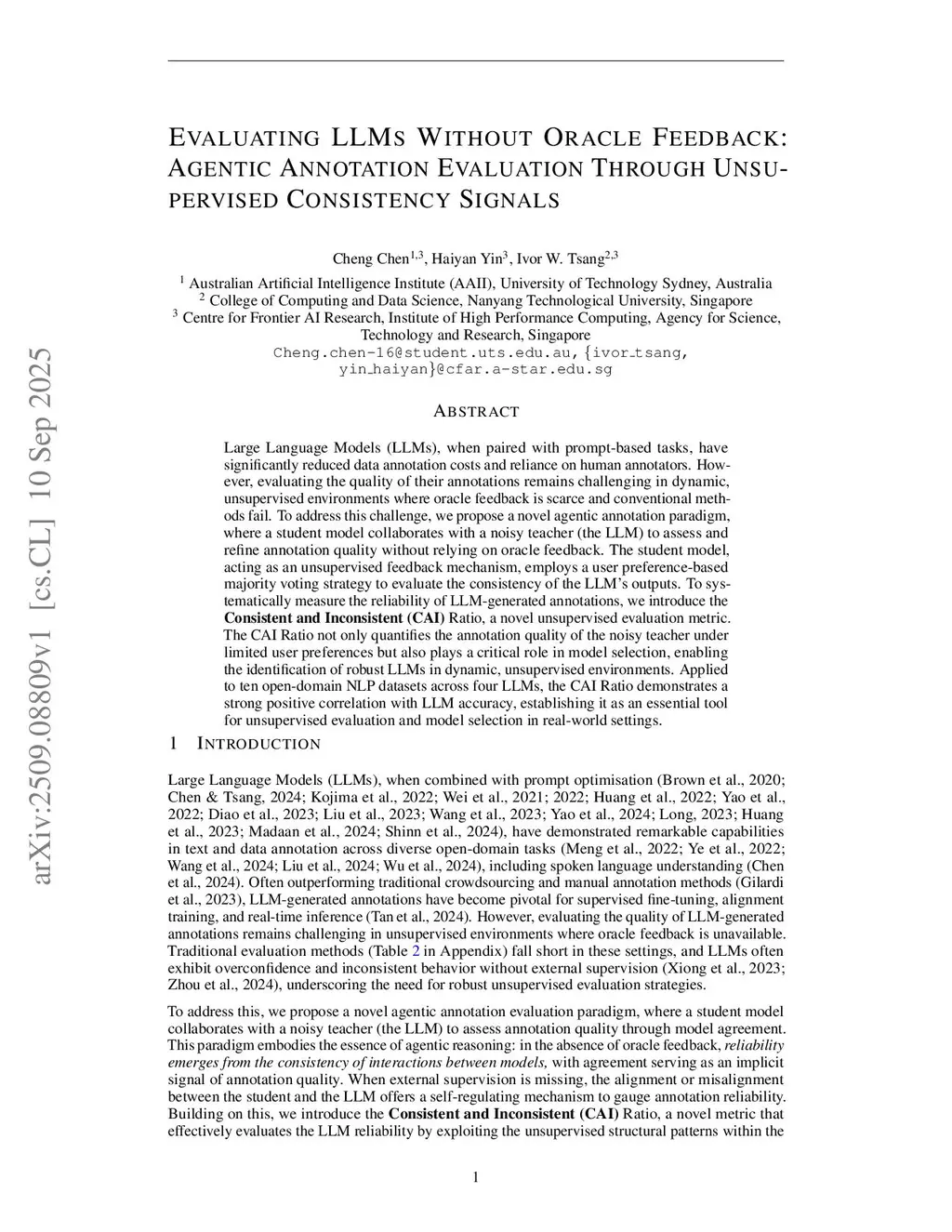 Large Language Models (LLMs), when paired with prompt-based tasks, have significantly reduced data annotation costs and reliance on human annotators. However, evaluating the quality of their annotations remains challenging in dynamic, unsupervised environments where oracle feedback is scarce and conventional methods fail. To address this challenge, we propose a novel agentic annotation paradigm, where a student model collaborates with a noisy teacher (the LLM) to assess and refine annotation quality without relying on oracle feedback. The student model, acting as an unsupervised feedback mechanism, employs a user preference-based majority voting strategy to evaluate the consistency of the LLM outputs. To systematically measure the reliability of LLM-generated annotations, we introduce the Consistent and Inconsistent (CAI) Ratio, a novel unsupervised evaluation metric. The CAI Ratio not only quantifies the annotation quality of the noisy teacher under limited user preferences but also plays a critical role in model selection, enabling the identification of robust LLMs in dynamic, unsupervised environments. Applied to ten open-domain NLP datasets across four LLMs, the CAI Ratio demonstrates a strong positive correlation with LLM accuracy, establishing it as an essential tool for unsupervised evaluation and model selection in real-world settings.