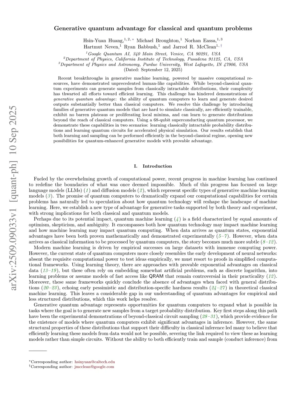 Recent breakthroughs in generative machine learning, powered by massive computational resources, have demonstrated unprecedented human-like capabilities. While beyond-classical quantum experiments can generate samples from classically intractable distributions, their complexity has thwarted all efforts toward efficient learning. This challenge has hindered demonstrations of generative quantum advantage: the ability of quantum computers to learn and generate desired outputs substantially better than classical computers. We resolve this challenge by introducing families of generative quantum models that are hard to simulate classically, are efficiently trainable, exhibit no barren plateaus or proliferating local minima, and can learn to generate distributions beyond the reach of classical computers. Using a -qubit superconducting quantum processor, we demonstrate these capabilities in two scenarios: learning classically intractable probability distributions and learning quantum circuits for accelerated physical simulation. Our results establish that both learning and sampling can be performed efficiently in the beyond-classical regime, opening new possibilities for quantum-enhanced generative models with provable advantage.