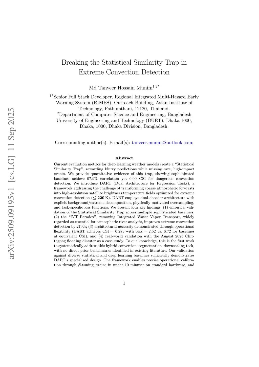 Current evaluation metrics for deep learning weather models create a "Statistical Similarity Trap", rewarding blurry predictions while missing rare, high-impact events. We provide quantitative evidence of this trap, showing sophisticated baselines achieve 97.9% correlation yet 0.00 CSI for dangerous convection detection. We introduce DART (Dual Architecture for Regression Tasks), a framework addressing the challenge of transforming coarse atmospheric forecasts into high-resolution satellite brightness temperature fields optimized for extreme convection detection (below 220 K). DART employs dual-decoder architecture with explicit background/extreme decomposition, physically motivated oversampling, and task-specific loss functions. We present four key findings: (1) empirical validation of the Statistical Similarity Trap across multiple sophisticated baselines; (2) the "IVT Paradox", removing Integrated Water Vapor Transport, widely regarded as essential for atmospheric river analysis, improves extreme convection detection by 270%; (3) architectural necessity demonstrated through operational flexibility (DART achieves CSI = 0.273 with bias = 2.52 vs. 6.72 for baselines at equivalent CSI), and (4) real-world validation with the August 2023 Chittagong flooding disaster as a case study. To our knowledge, this is the first work to systematically address this hybrid conversion-segmentation-downscaling task, with no direct prior benchmarks identified in existing literature. Our validation against diverse statistical and deep learning baselines sufficiently demonstrates DART's specialized design. The framework enables precise operational calibration through beta-tuning, trains in under 10 minutes on standard hardware, and integrates seamlessly with existing meteorological workflows, demonstrating a pathway toward trustworthy AI for extreme weather preparedness.