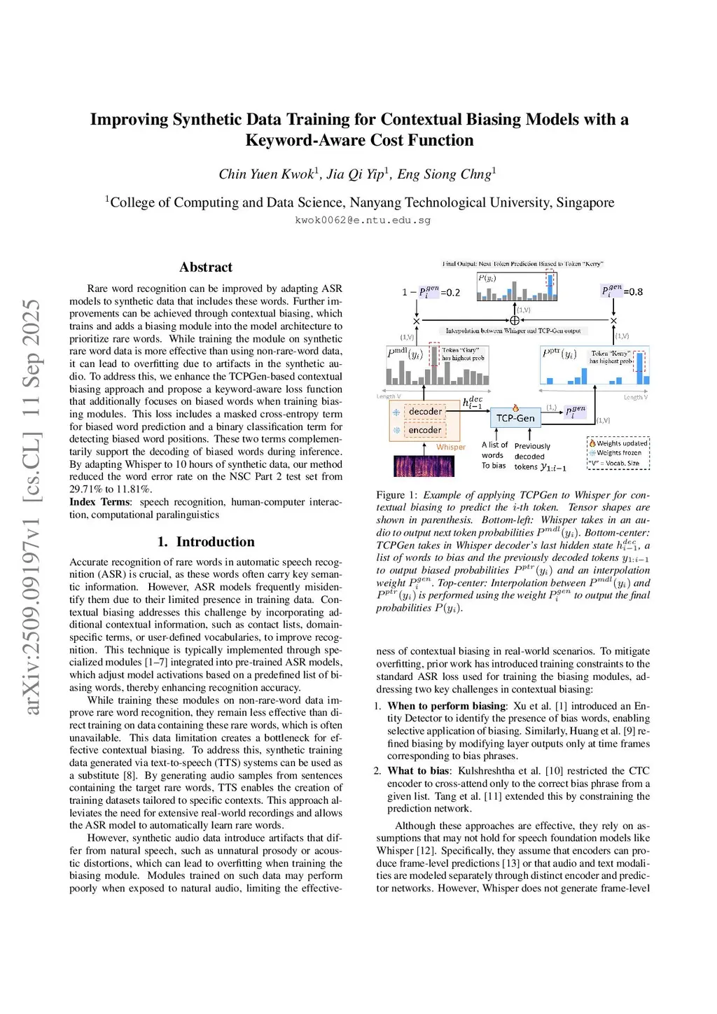 Rare word recognition can be improved by adapting ASR models to synthetic data that includes these words. Further improvements can be achieved through contextual biasing, which trains and adds a biasing module into the model architecture to prioritize rare words. While training the module on synthetic rare word data is more effective than using non-rare-word data, it can lead to overfitting due to artifacts in the synthetic audio. To address this, we enhance the TCPGen-based contextual biasing approach and propose a keyword-aware loss function that additionally focuses on biased words when training biasing modules. This loss includes a masked cross-entropy term for biased word prediction and a binary classification term for detecting biased word positions. These two terms complementarily support the decoding of biased words during inference. By adapting Whisper to 10 hours of synthetic data, our method reduced the word error rate on the NSC Part 2 test set from 29.71% to 11.81%.