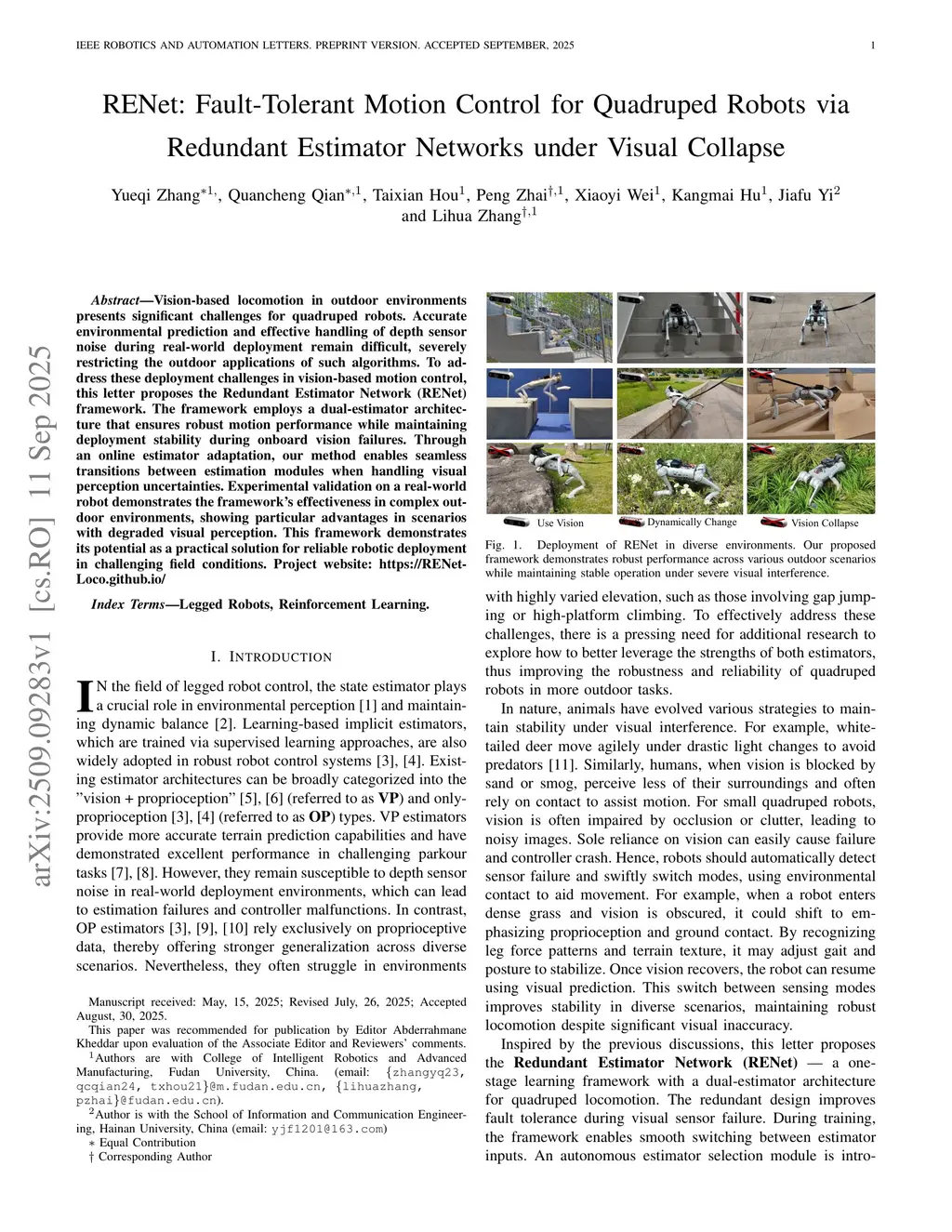 RENet: Fault-Tolerant Motion Control for Quadruped Robots via Redundant Estimator Networks under Visual Collapse
