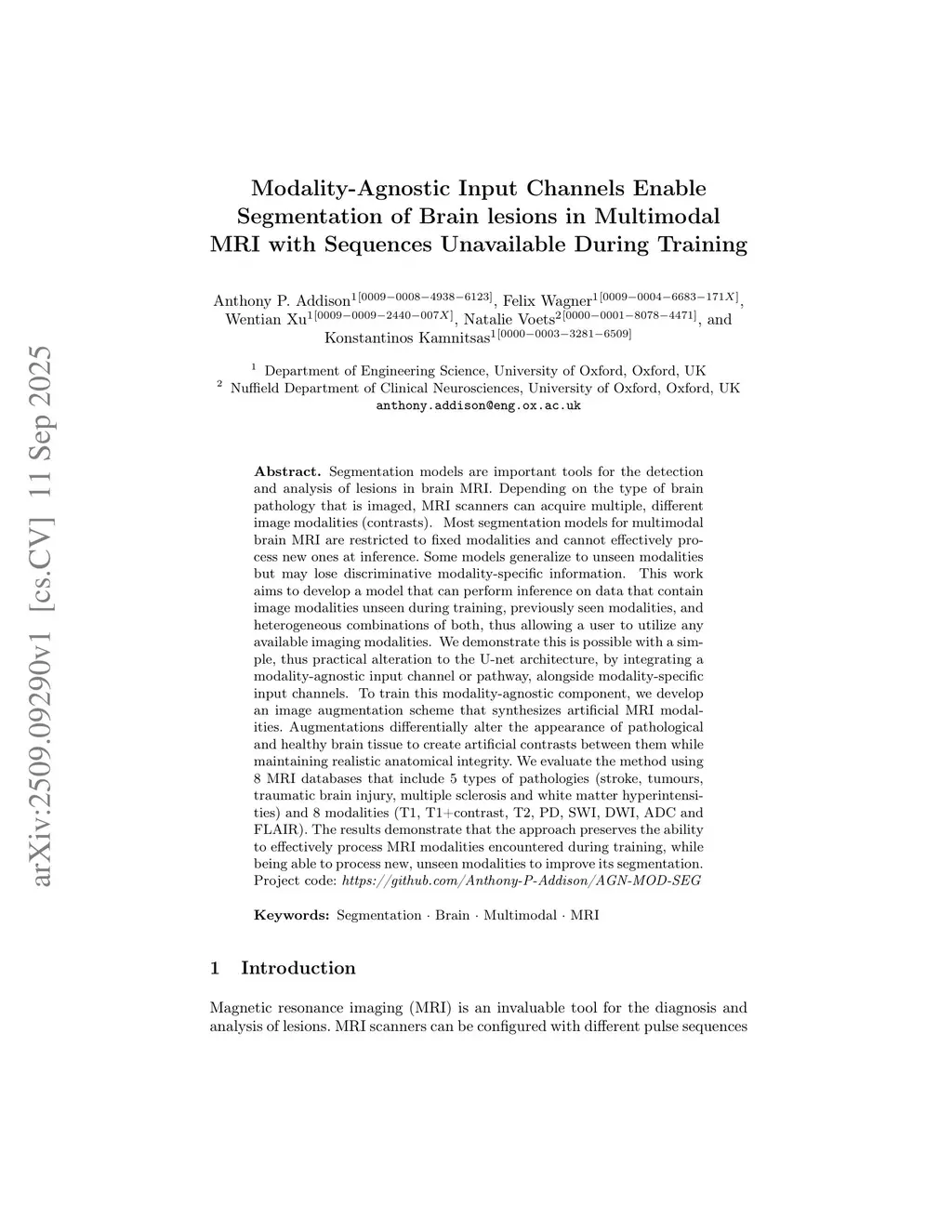 Segmentation models are important tools for the detection and analysis of lesions in brain MRI. Depending on the type of brain pathology that is imaged, MRI scanners can acquire multiple, different image modalities (contrasts). Most segmentation models for multimodal brain MRI are restricted to fixed modalities and cannot effectively process new ones at inference. Some models generalize to unseen modalities but may lose discriminative modality-specific information. This work aims to develop a model that can perform inference on data that contain image modalities unseen during training, previously seen modalities, and heterogeneous combinations of both, thus allowing a user to utilize any available imaging modalities. We demonstrate this is possible with a simple, thus practical alteration to the U-net architecture, by integrating a modality-agnostic input channel or pathway, alongside modality-specific input channels. To train this modality-agnostic component, we develop an image augmentation scheme that synthesizes artificial MRI modalities. Augmentations differentially alter the appearance of pathological and healthy brain tissue to create artificial contrasts between them while maintaining realistic anatomical integrity. We evaluate the method using 8 MRI databases that include 5 types of pathologies (stroke, tumours, traumatic brain injury, multiple sclerosis and white matter hyperintensities) and 8 modalities (T1, T1+contrast, T2, PD, SWI, DWI, ADC and FLAIR). The results demonstrate that the approach preserves the ability to effectively process MRI modalities encountered during training, while being able to process new, unseen modalities to improve its segmentation. Project code:this https URL