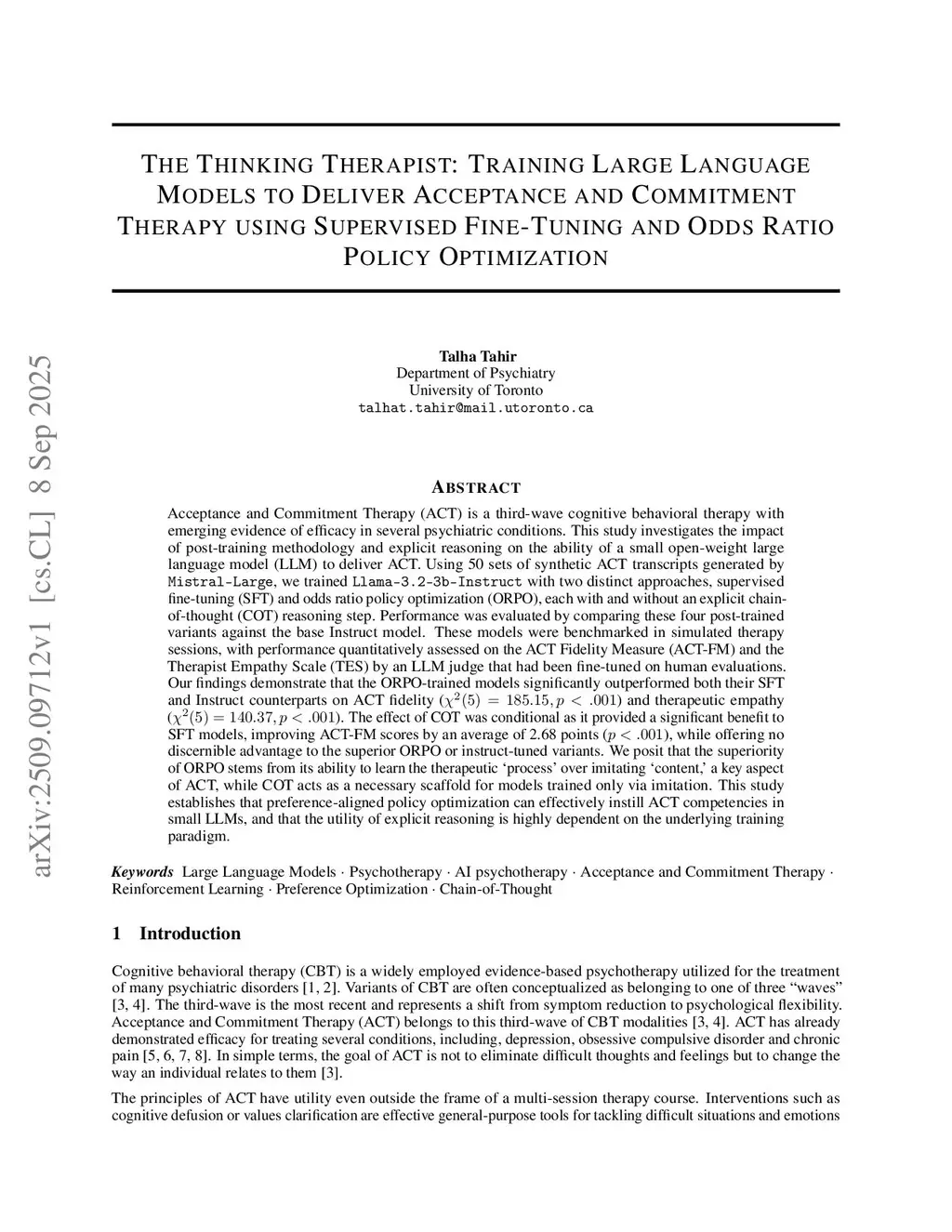 Acceptance and Commitment Therapy (ACT) is a third-wave cognitive behavioral therapy with emerging evidence of efficacy in several psychiatric conditions. This study investigates the impact of post-training methodology and explicit reasoning on the ability of a small open-weight large language model (LLM) to deliver ACT. Using synthetic ACT transcripts generated by Mistral-Large, we trained Llama-3.2-3b-Instruct with two distinct approaches, supervised fine-tuning (SFT) and odds ratio policy optimization (ORPO), each with and without an explicit chain-of-thought (COT) reasoning step. Performance was evaluated by comparing these four post-trained variants against the base Instruct model. These models were benchmarked in simulated therapy sessions, with performance quantitatively assessed on the ACT Fidelity Measure (ACT-FM) and the Therapist Empathy Scale (TES) by an LLM judge that had been fine-tuned on human evaluations. Our findings demonstrate that the ORPO-trained models significantly outperformed both their SFT and Instruct counterparts on ACT fidelity () and therapeutic empathy (). The effect of COT was conditional as it provided a significant benefit to SFT models, improving ACT-FM scores by an average of 2.68 points (), while offering no discernible advantage to the superior ORPO or instruct-tuned variants. We posit that the superiority of ORPO stems from its ability to learn the therapeutic `process' over imitating `content,' a key aspect of ACT, while COT acts as a necessary scaffold for models trained only via imitation. This study establishes that preference-aligned policy optimization can effectively instill ACT competencies in small LLMs, and that the utility of explicit reasoning is highly dependent on the underlying training paradigm.